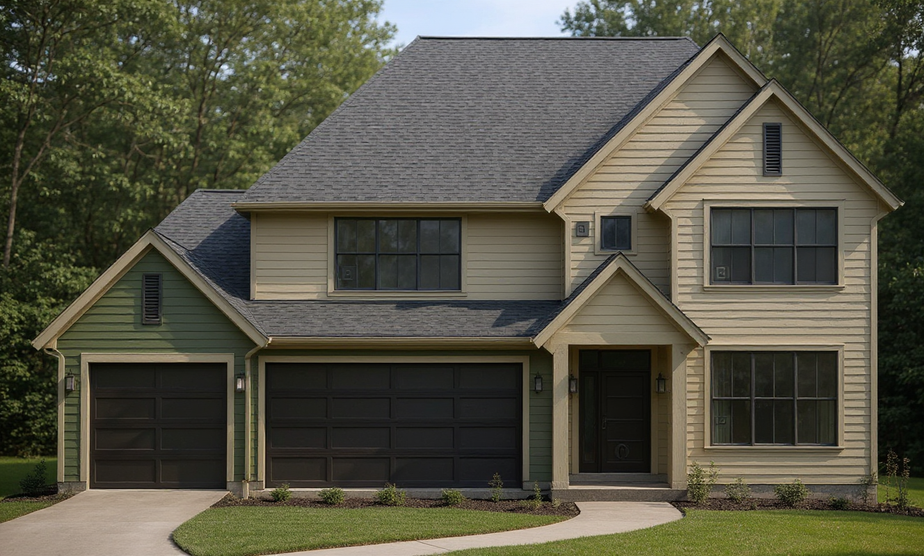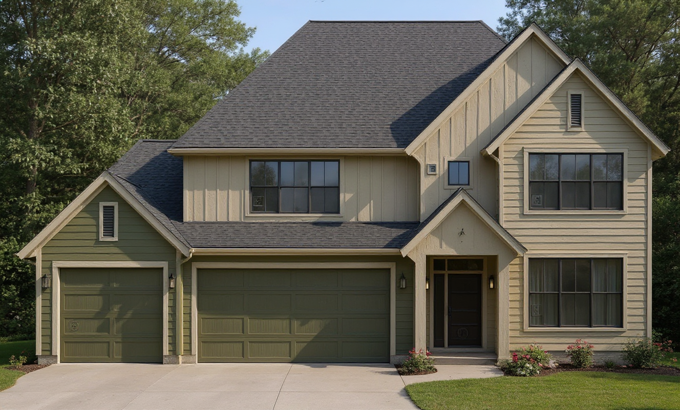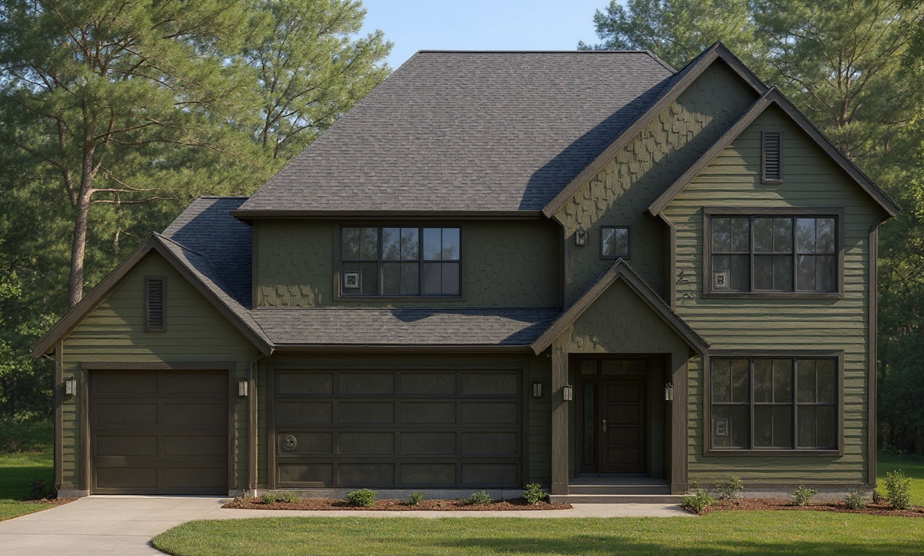modern minimalist building in a lush forest setting crisp white walls with subtle gray shadows surrounded by vibrant green grass and dense dark green trees soft overcast sky with a hint of sunlight filtering through creating a calm and serene atmosphere the architecture features clean lines and geometric shapes accentuated by the natural harmony of the environment
