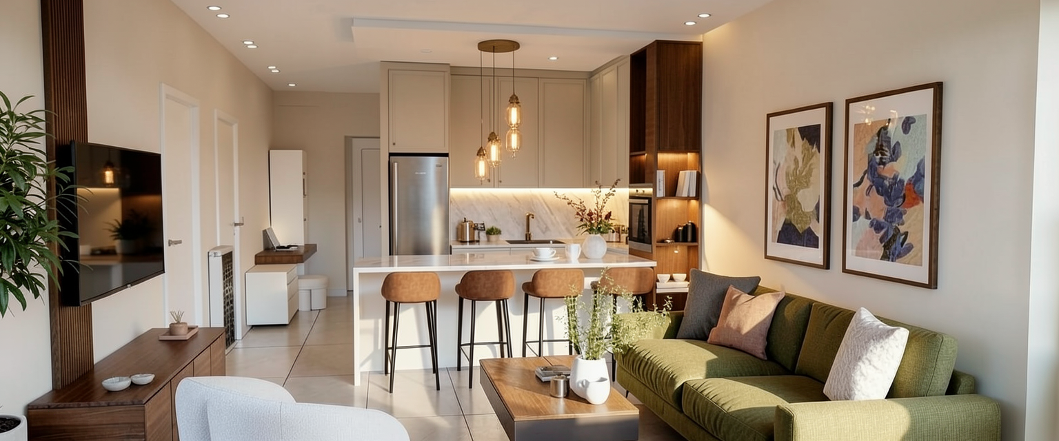 photorealistic render strictly based on the provided reference image of a tradeshow booth match geometry proportions layout and design exactly as shown do not add remove or reinterpret any elements open corner booth structure with flat roof and exposed vertical and horizontal beams in medium beige natural wood wood has a matte finish and subtle grain no color shift exterior and interior wall panels in very dark red brown color ncs s 8010 y90r matte finish uniform tone interior kitchen layout exactly as shown island with dark cabinetry and dark countertop rear cabinetry wall with built in range and hood light gray stone slab backsplash with soft veining cabinet doors are recessed panel style dark finish no added detailing lighting replicated from the model simple pendant lights and wall mounted fixtures positioned exactly as shown neutral warm white light no dramatic lighting effects floor in flat neutral gray with smooth texture consistent with a tradeshow environment camera angle perspective and framing match the reference image as closely as possible background kept minimal and neutral no branding emphasis no stylistic enhancement render style clean realistic accurate material translation even lighting no cinematic effects the ateliers jacob logo should be retro lit and installed on the arch on the right hand side in a minimalist look