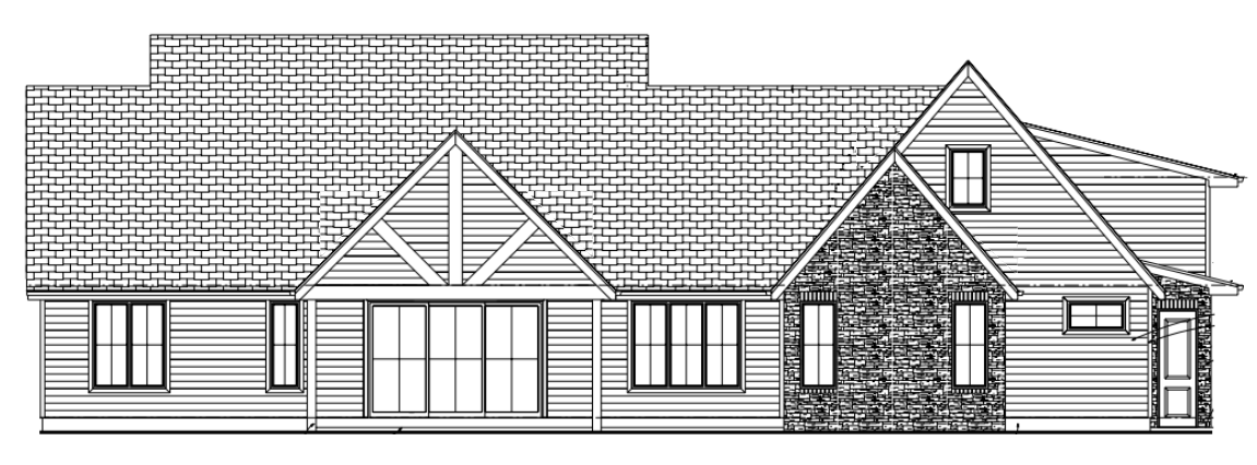 render a beautiful suburban house with a modern cozy atmosphere the roof is covered with dark grey shingles providing a sleek contrast use a soft cream color for the walls accented with a light grey stone texture on the right side of the structure the large windows should have black frames giving a contemporary finish the front door is a warm welcoming mahogany add lush green grass surrounding the house with a clear blue sky and gentle sunlight casting soft shadows for a serene ambiance