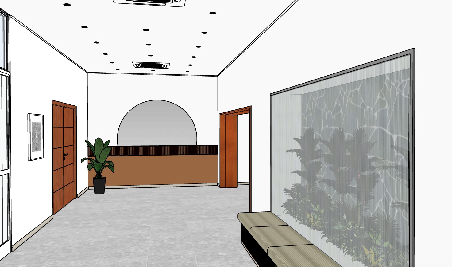 no reflection in the mirror in the plant aquarium the glass allows the shadows of the plants to be seen but is opaque white preserves the textures and colors of the bench s fabric