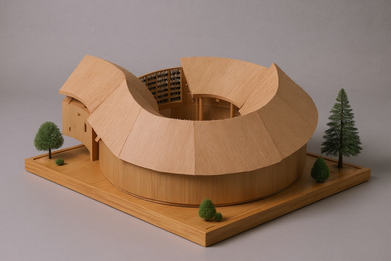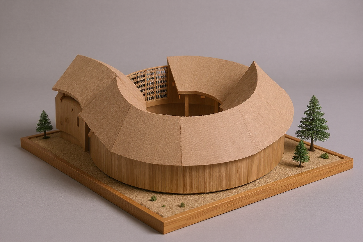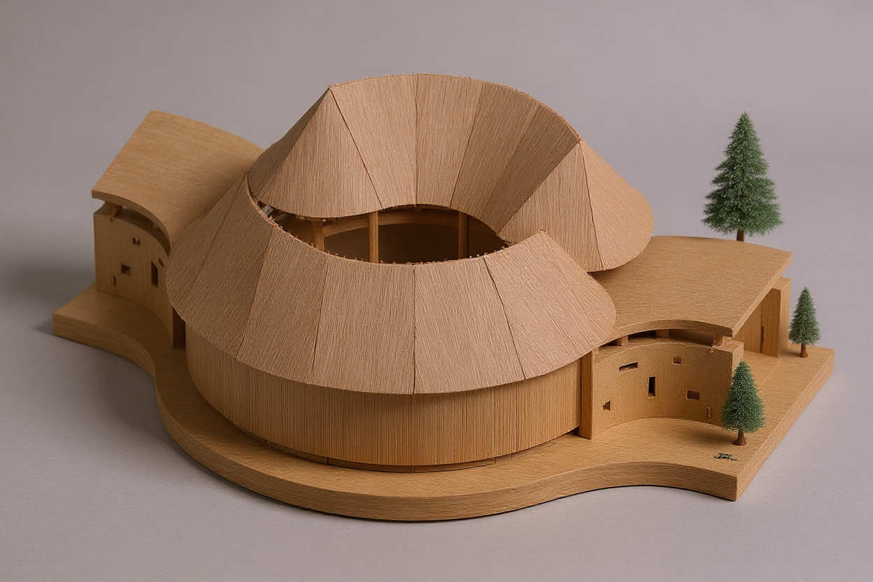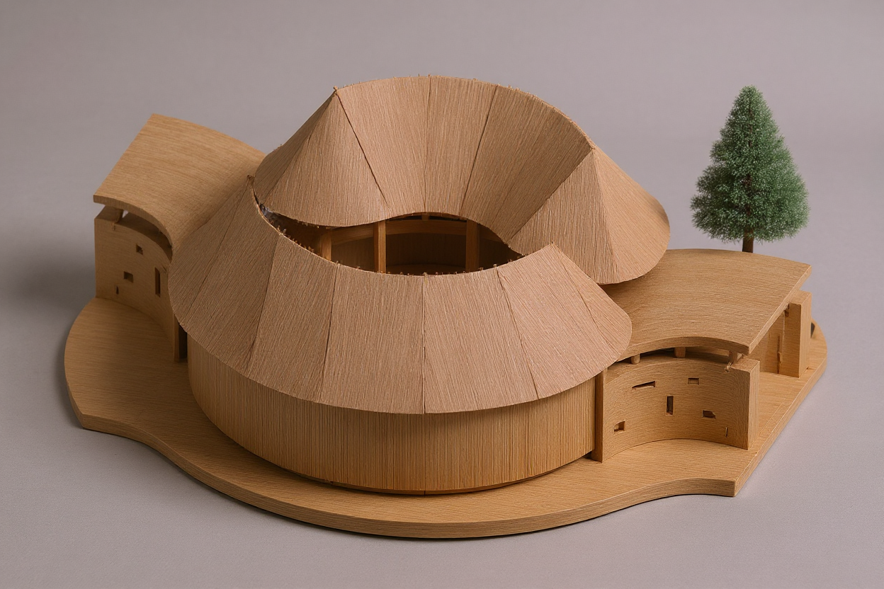 the architectural model is mounted on a base made of the same material and is accompanied by small natural look miniature trees placed on both sides providing scale and context the background is neutral and gray typical of a studio photograph for architectural models the model itself is crafted from materials resembling balsa wood or kraft cardboard