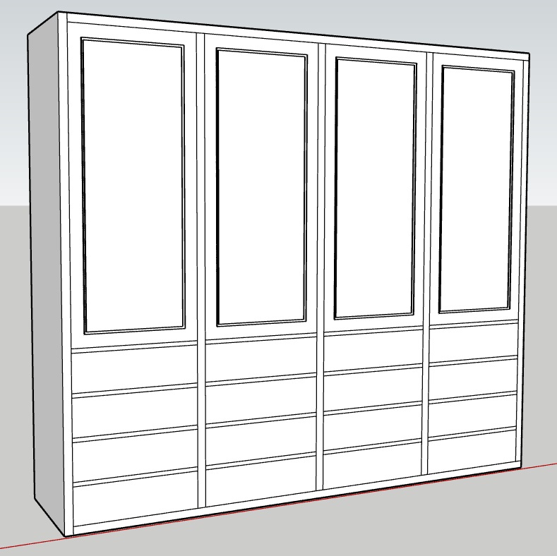 modernist exterior shot a modern wardrobe with four tall doors and a series of drawers crafted from rich mahogany wood with a polished finish the panels are highlighted with gold accents and the handles are sleek brushed nickel the background is a softly lit room with warm beige walls reflecting a cozy inviting atmosphere natural sunlight streams in from the side casting gentle shadows that enhance the elegant contours of the wardrobe architecture