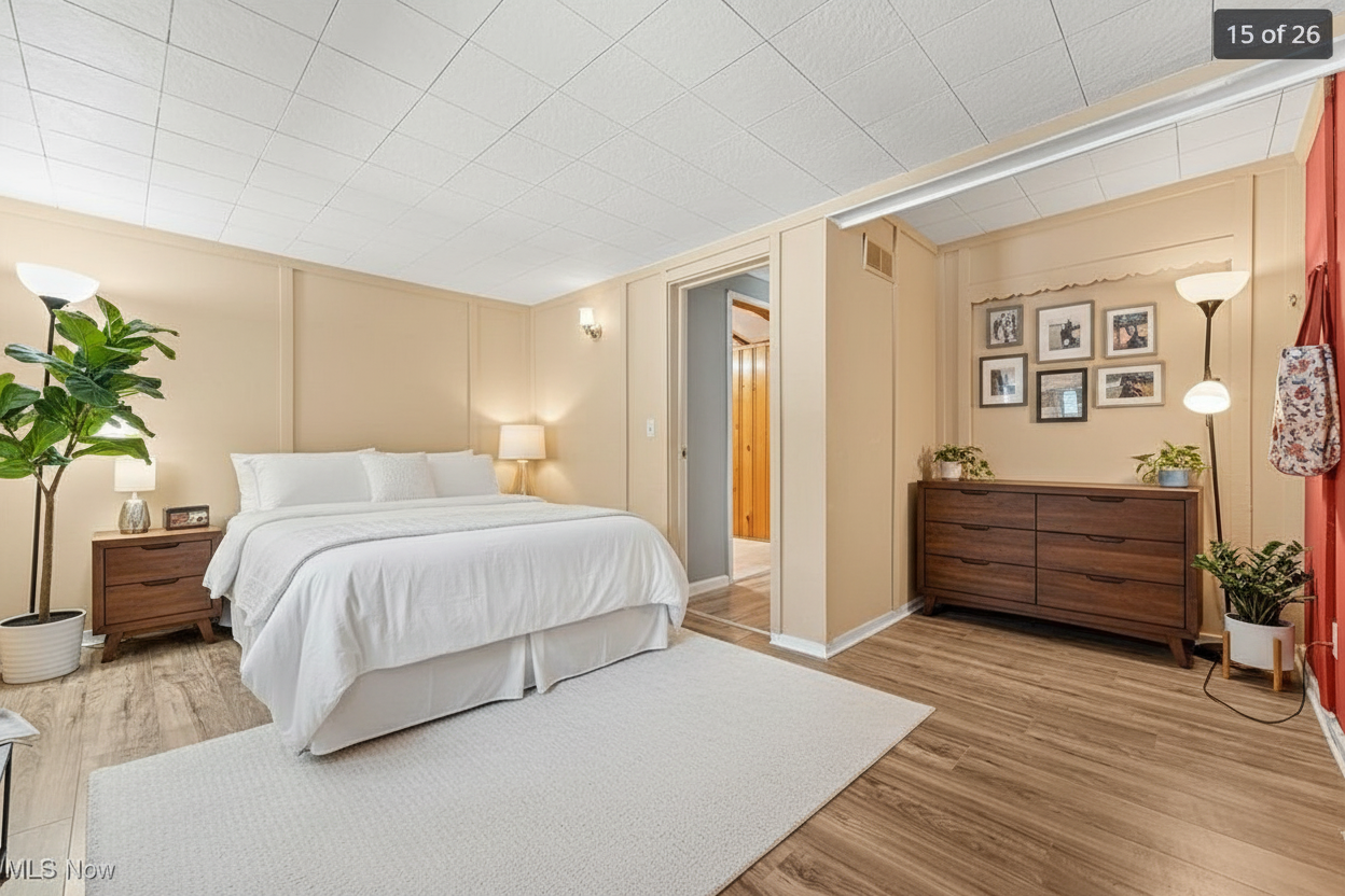 remove the wood burning stove replace the red carpet and carpeted steps with typical white square tiling add a rug and sunroom furniture with plants paint the half wall white