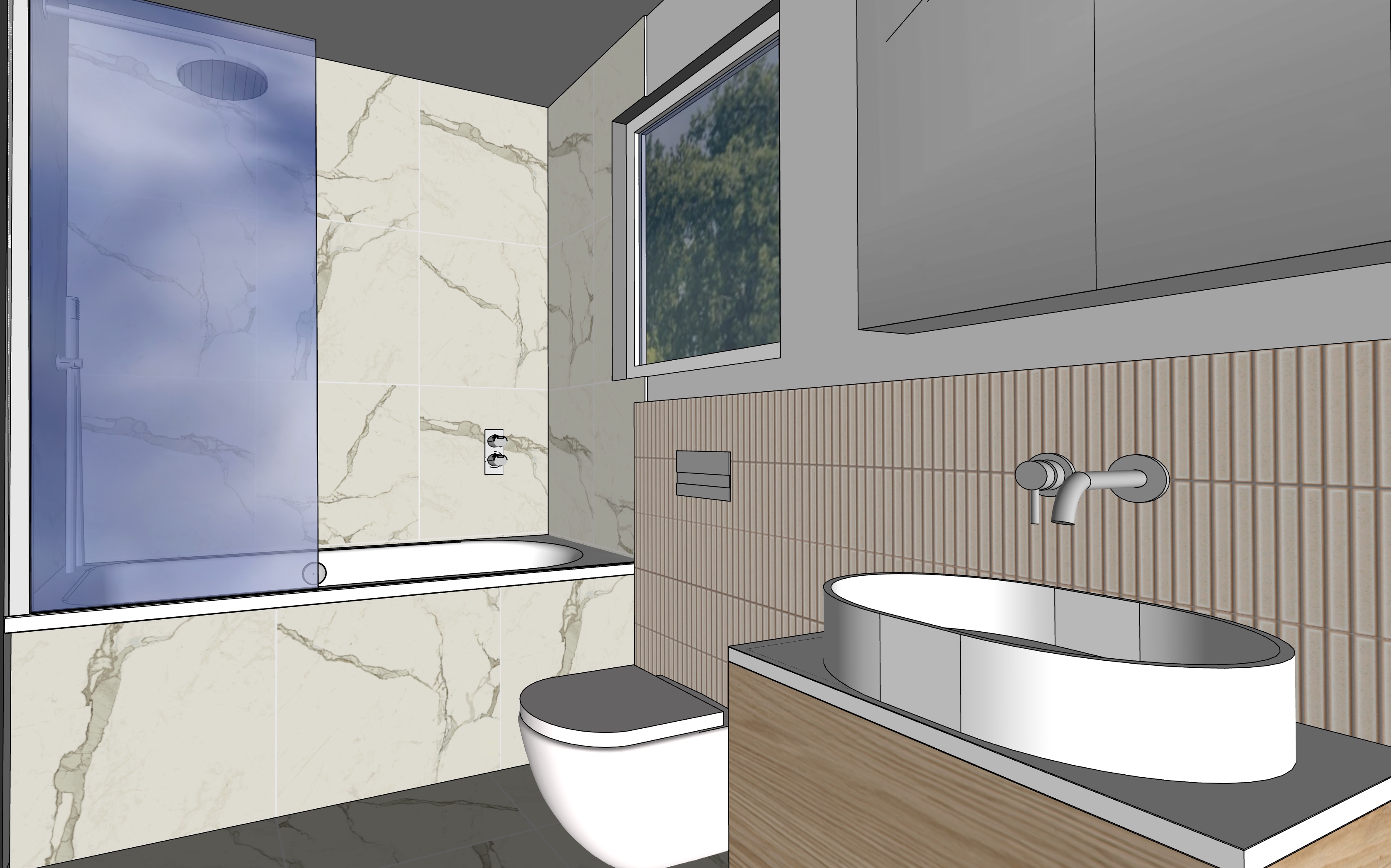 calm and soft natural lighting in this marbled bathroom