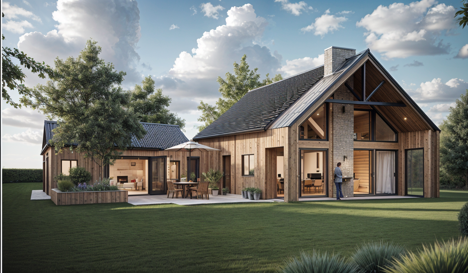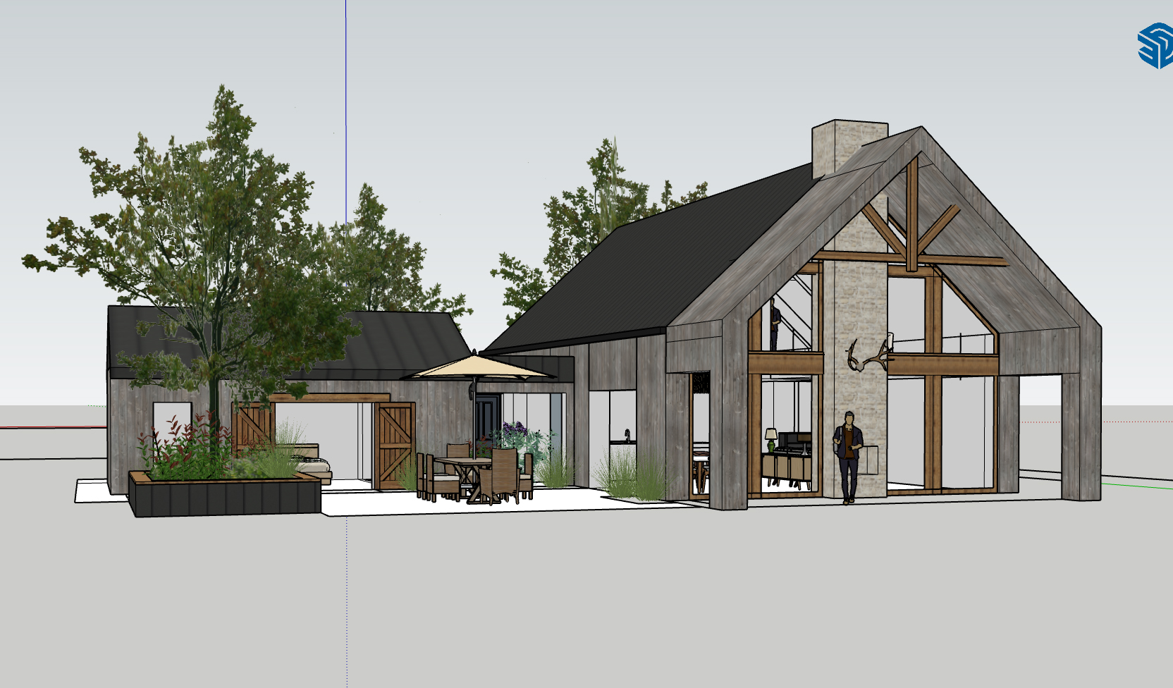 exterior view of the house consisting of 2 wings the main living area and the bedroom area the house inspired by norwegian barns light wood dark sheet metal roof natural light stone natural materials the house is surrounded by a garden and fields and forests at the back