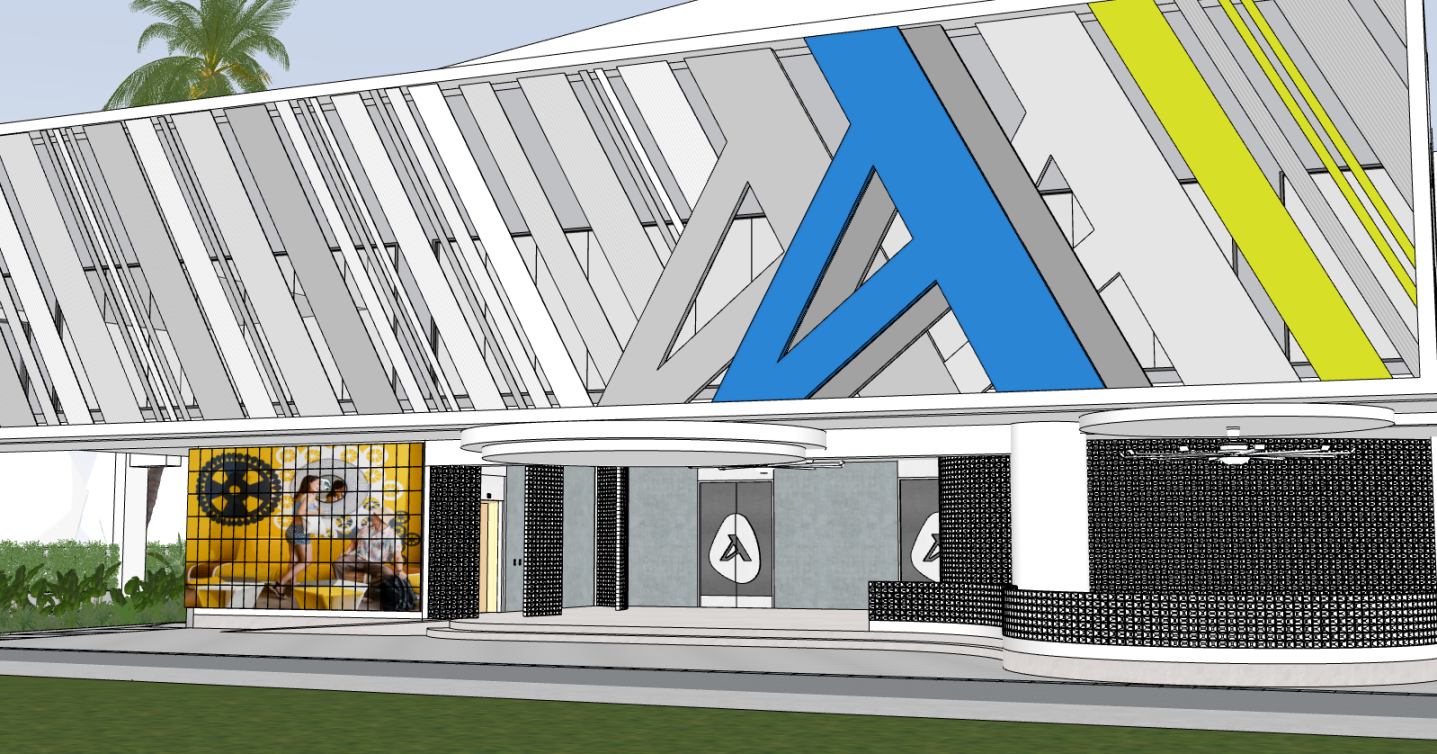 make the wall at the left into a led video wall make the mood into daytime make the small square pattern color white provide people at the building lobby