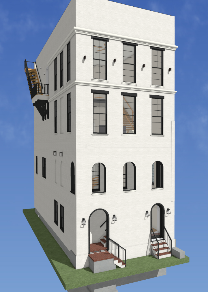photorealistic exterior render of the exact same building shown in the input image do not change geometry keep all window and door counts sizes locations and proportions exactly the same keep rooflines parapets balconies railings columns slab edges and floor to floor heights unchanged no added removed resized or relocated openings no style redesign only improve materials lighting shadows reflections and realism add a basic tropical landscape design with a sidewalk out front this is a zero lot line and there are other structures on either side that are equally as tall but different styles on the left side there is a modern farm house style four story home with a similar layout on the right hand side only three feet away is a red brick four story home