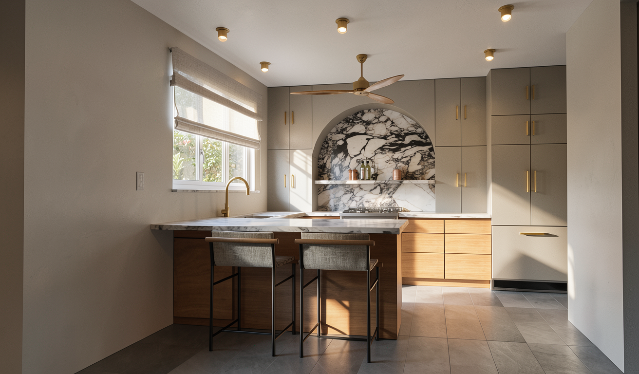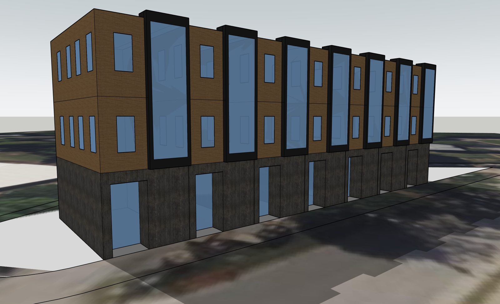 need a photoreal rendering for an urban modernist townhouse scheme on this curved corner lot between residential and warehouse districts use the gis overlay image for context where possible keep this photot real a dusk shot with windows providing a warm glow provide some street trees and use a combination of black brick cladding at the lower level and wood cladding above trim and windows should be black