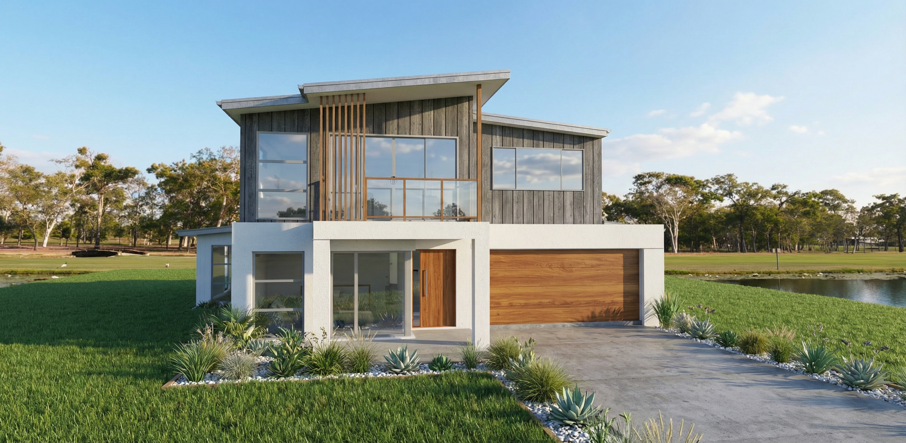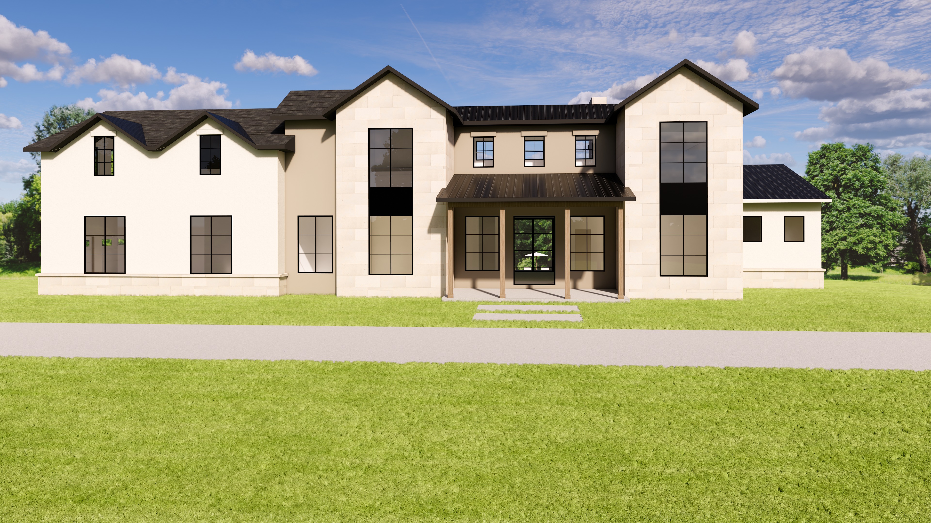 add a medium size holly pencil tree on the left side of the house in the left corner with a minimal amount of boxwood bushes katl foerster grass and salvia plants right infront of the house and perimeter the pencil tree should be right next to the first window on the left side of the house and use less bushes
