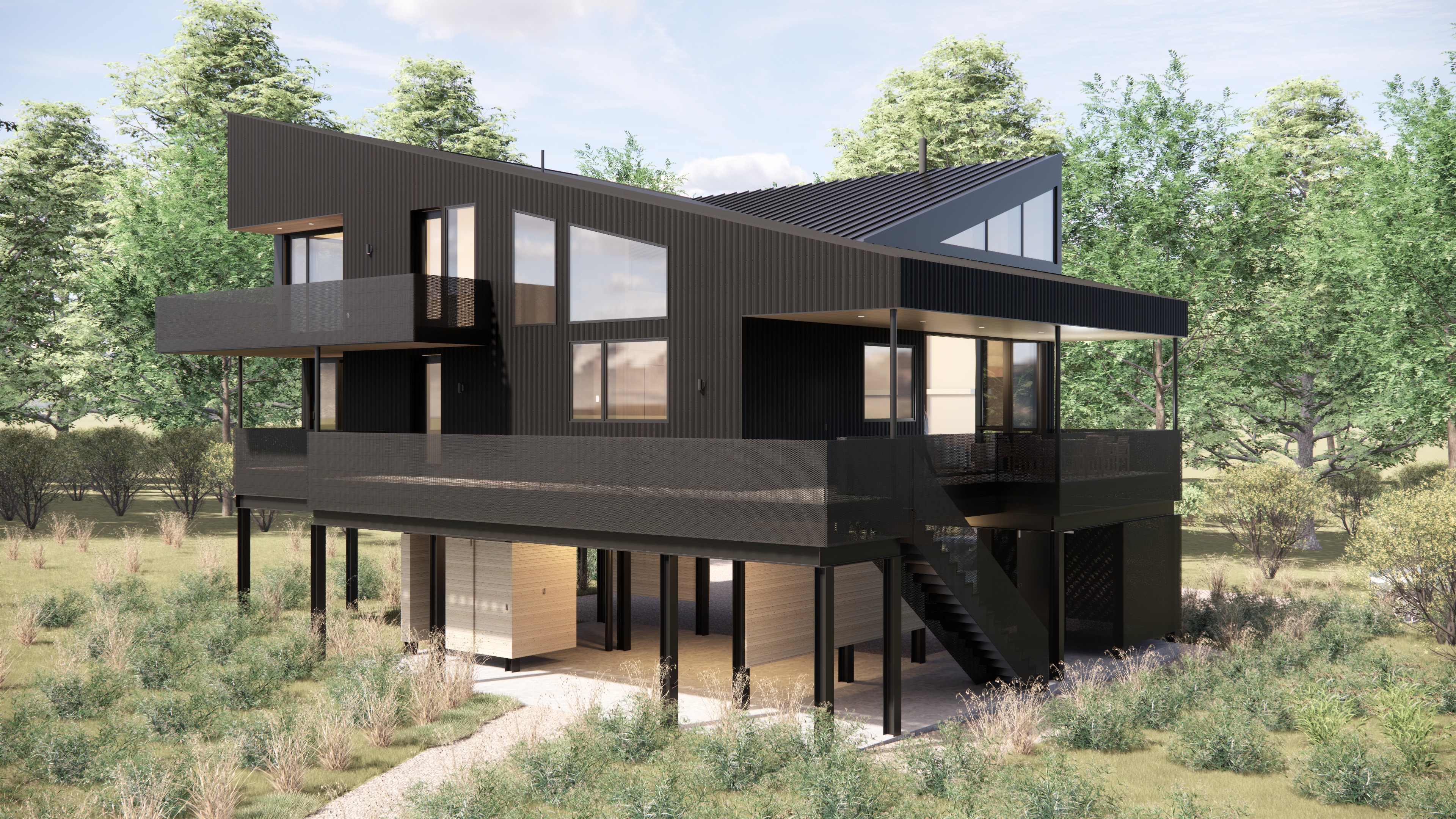make realistic add texture to the landscape soften up the sky show a person walking up the stairs