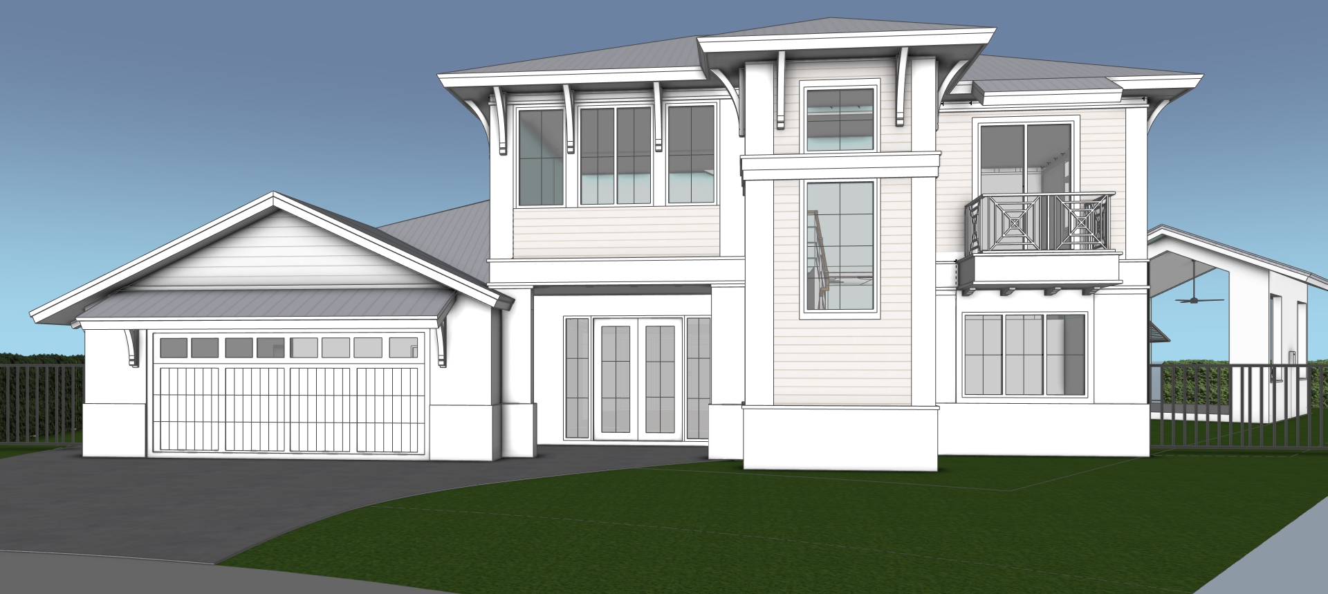 high quality photorealistic image of a west indies style house located in a florida suburban neighborhood with beautiful landscape dark gray metal roof with black frame windows and white color walls