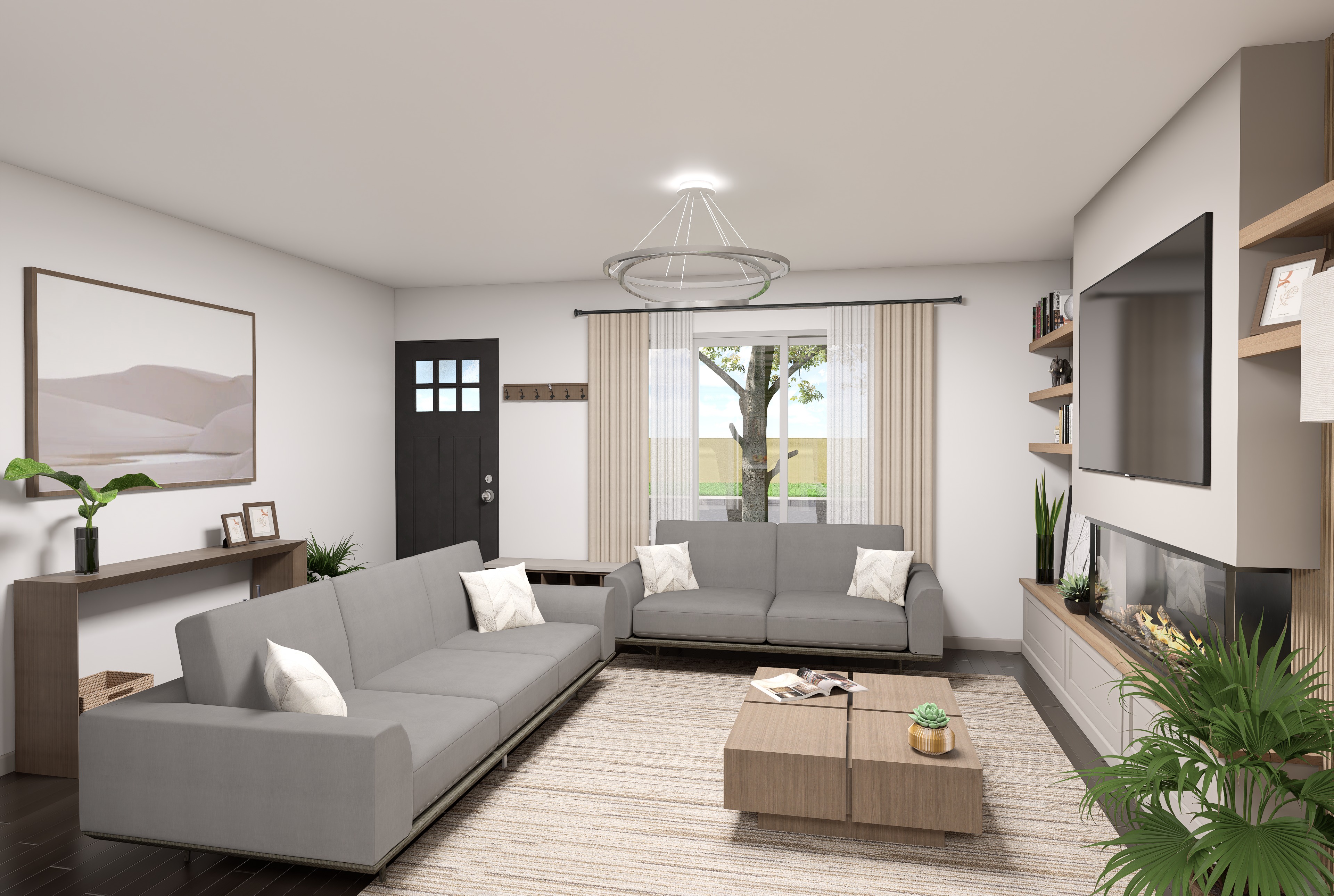 photorealistic architectural visualization of a modern minimalist living room 8k resolution unreal engine 5 render style features a soft grey fabric sectional sofa and a secondary matching sofa central square modular wooden coffee table over a textured beige rug accent wall with a large black flat screen tv integrated above a sleek glass linear fireplace with realistic orange flames a silver multi ring led halo chandelier hangs from the ceiling lighting cinematic natural daylight streaming through a large window with sheer curtains creating soft shadows and highlights materials polished dark wood flooring light oak shelving matte white walls and lush green indoor plants for a touch of life sharp focus high contrast professional interior photography style