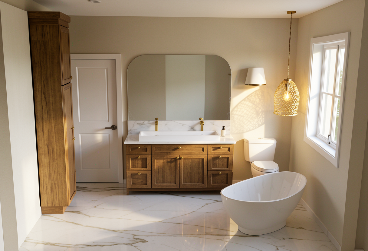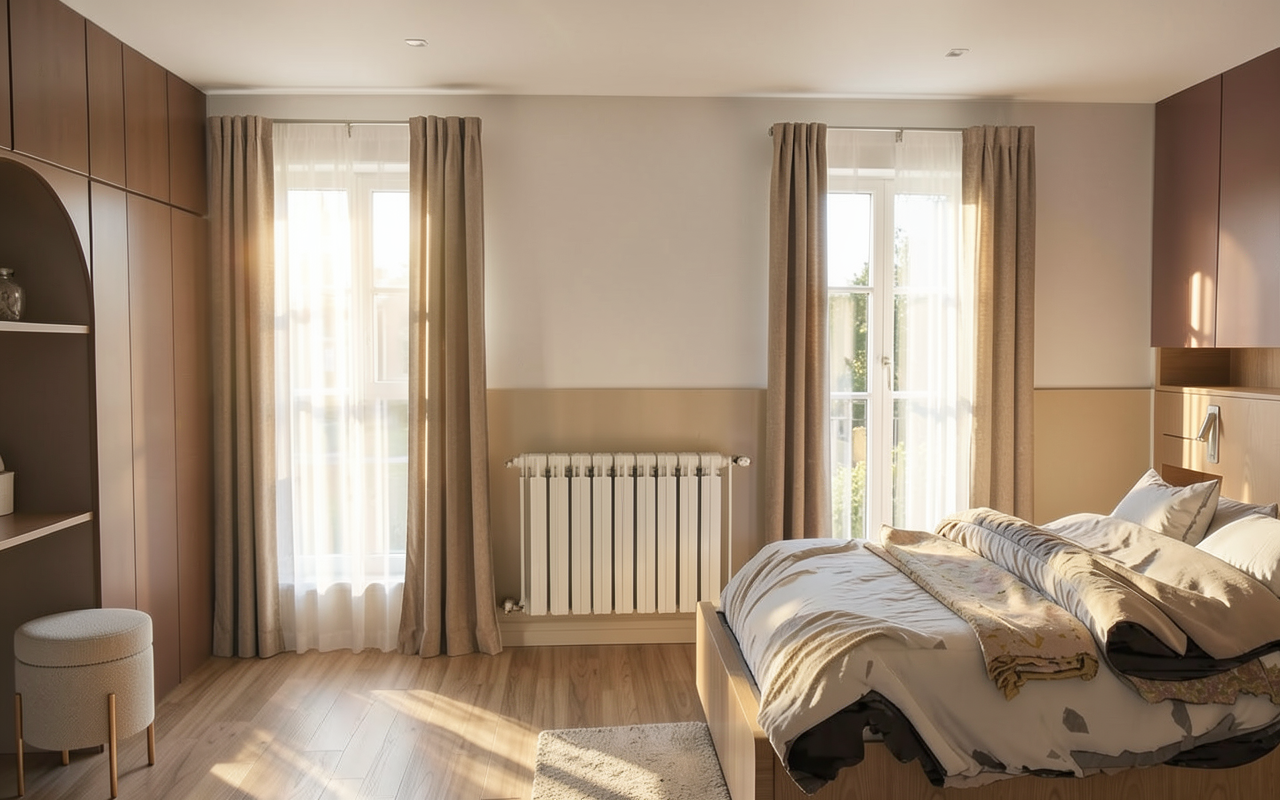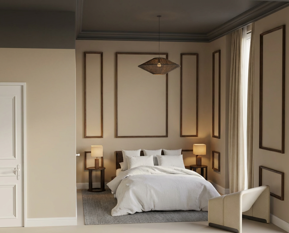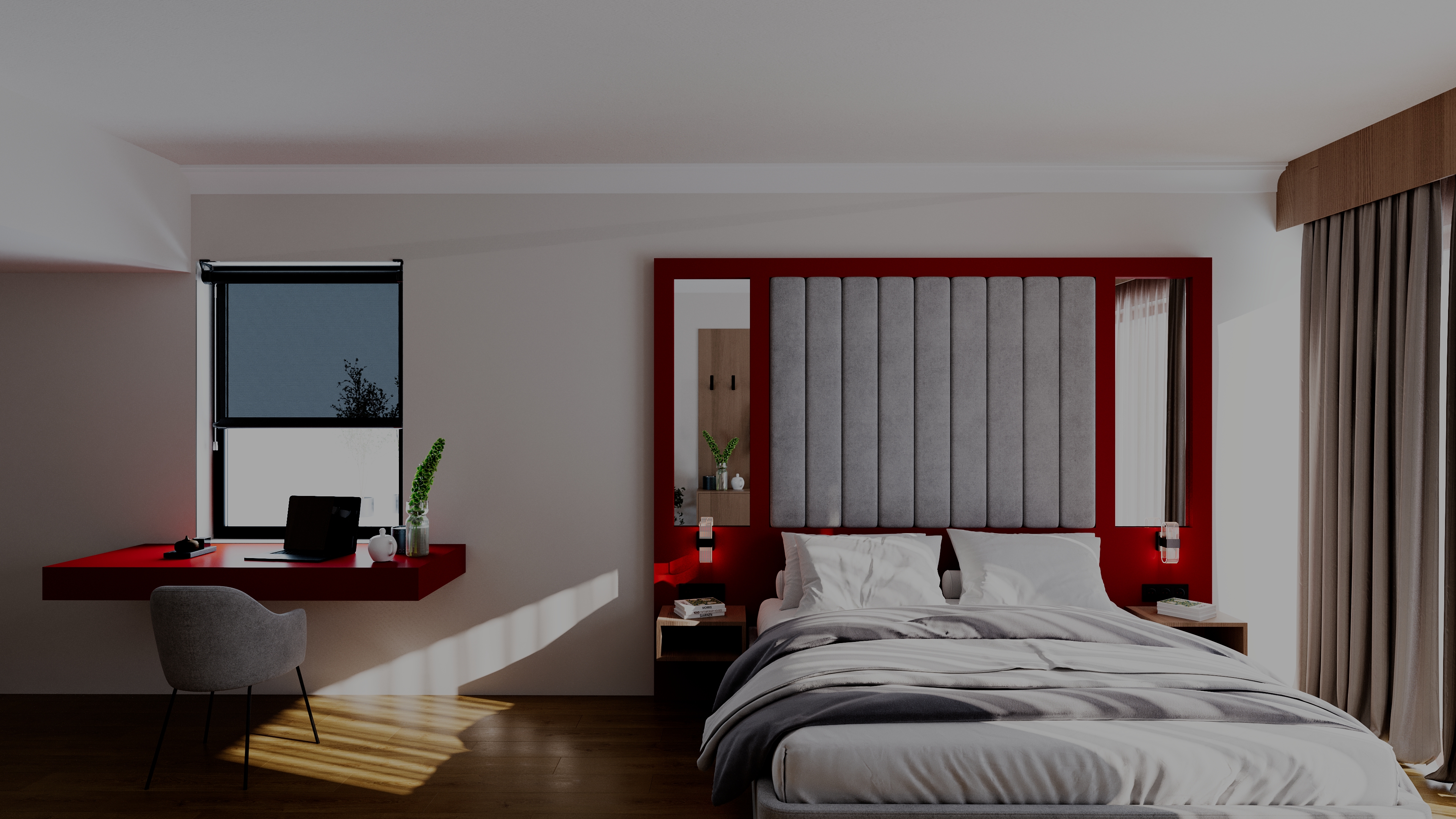 enhance this bedroom render into a high end ultra realistic architectural visualization while keeping the design exactly the same do not change the layout bed design headboard shape vertical upholstered panel design mirror positions desk shape chair shape window position curtain design wall design floor layout furniture placement proportions lighting fixture positions or camera angle preserve the exact composition exactly as shown focus only on making this render look real premium and professionally photographed material realism red lacquered wood elements around the headboard and floating desk must look like a premium deep red lacquer finish smooth and refined with subtle reflectivity realistic edge definition and rich depth not flat or plastic upholstered headboard panels should have realistic soft fabric texture subtle tonal variation deeper shadow separation between panels and believable softness bedding should look highly realistic with natural folds layered cotton texture realistic weight and soft creasing nightstands should keep the exact design but gain realistic material depth and cleaner edges dark wood floor should look more realistic with natural plank definition subtle grain variation controlled reflection and richer material response chair upholstery should have realistic woven fabric texture and soft shading mirrors should have accurate reflection proper depth and clean edges curtains and sheers should have realistic folds thickness transparency and natural interaction with daylight walls and ceiling should have subtle real painted surface texture and soft light falloff lighting realism keep the same overall lighting concept and same light positions maintain the daylight entering from the right side and the sunlight streak on the floor make daylight physically accurate and natural with better bounce light and realistic contrast improve the bedside lights so they feel integrated and believable with soft warm glow and realistic light spread reduce flat cgi look and improve ambient occlusion in corners under furniture around bedding and along panel joints keep bright areas controlled not blown out and darker areas detailed not muddy overall realism realistic global illumination cleaner material separation sharper micro detail soft but realistic shadow transitions premium hotel bedroom photography mood high resolution clarity believable exposure and contrast no cartoon look no stylized finish no plastic materials important do not redesign anything do not change colors do not replace the red elements do not move anything do not add objects and do not alter the framing only make this exact render look significantly more realistic negative prompt redesign changed layout changed bed design changed headboard changed desk changed chair changed mirrors changed curtains changed materials changed red color extra decor missing objects blurry textures distorted reflections plastic finish flat lighting overexposed highlights stylized render cartoon look different camera angle add this ending line too push this image toward maximum photorealism with premium material response realistic daylight behavior rich depth and luxury interior photography quality while preserving the exact design unchanged