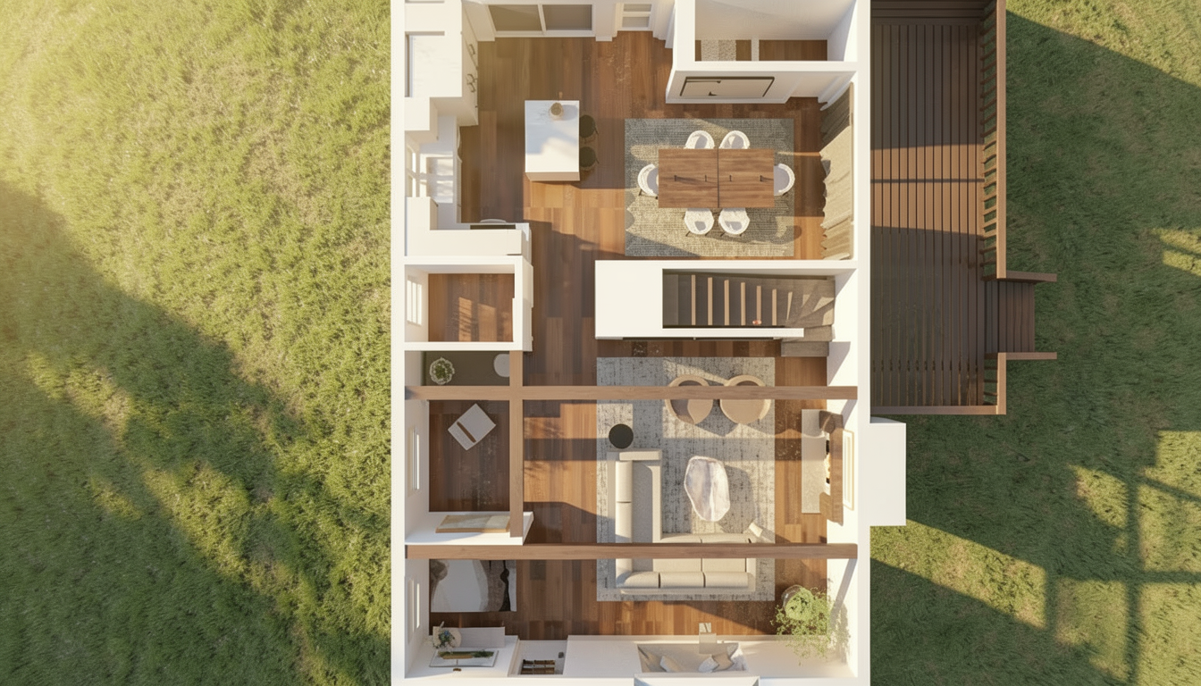 convert this floor plan into a modern isometric 3d view of a full house show the space from an elevated angle with furniture walls and details visible transform the 2d furniture layout into a clean isometric 3d architectural diagram maintain exact scale and furniture positions from the plan use simplified geometry with realistic light materials white walls light oak floor neutral beige and grey furniture avoid changing the layout render in a professional architectural presentation style with soft daylight minimal shadows and clear spatial readability use the same furniture as shows on the plan do not change the orientation of the floorplan