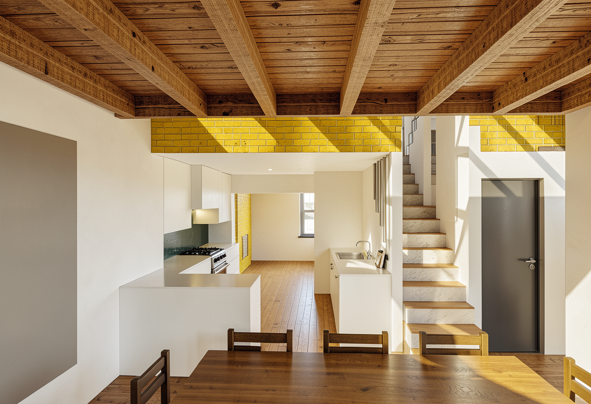show with slightly yellow brick and ceiling with smooth wood