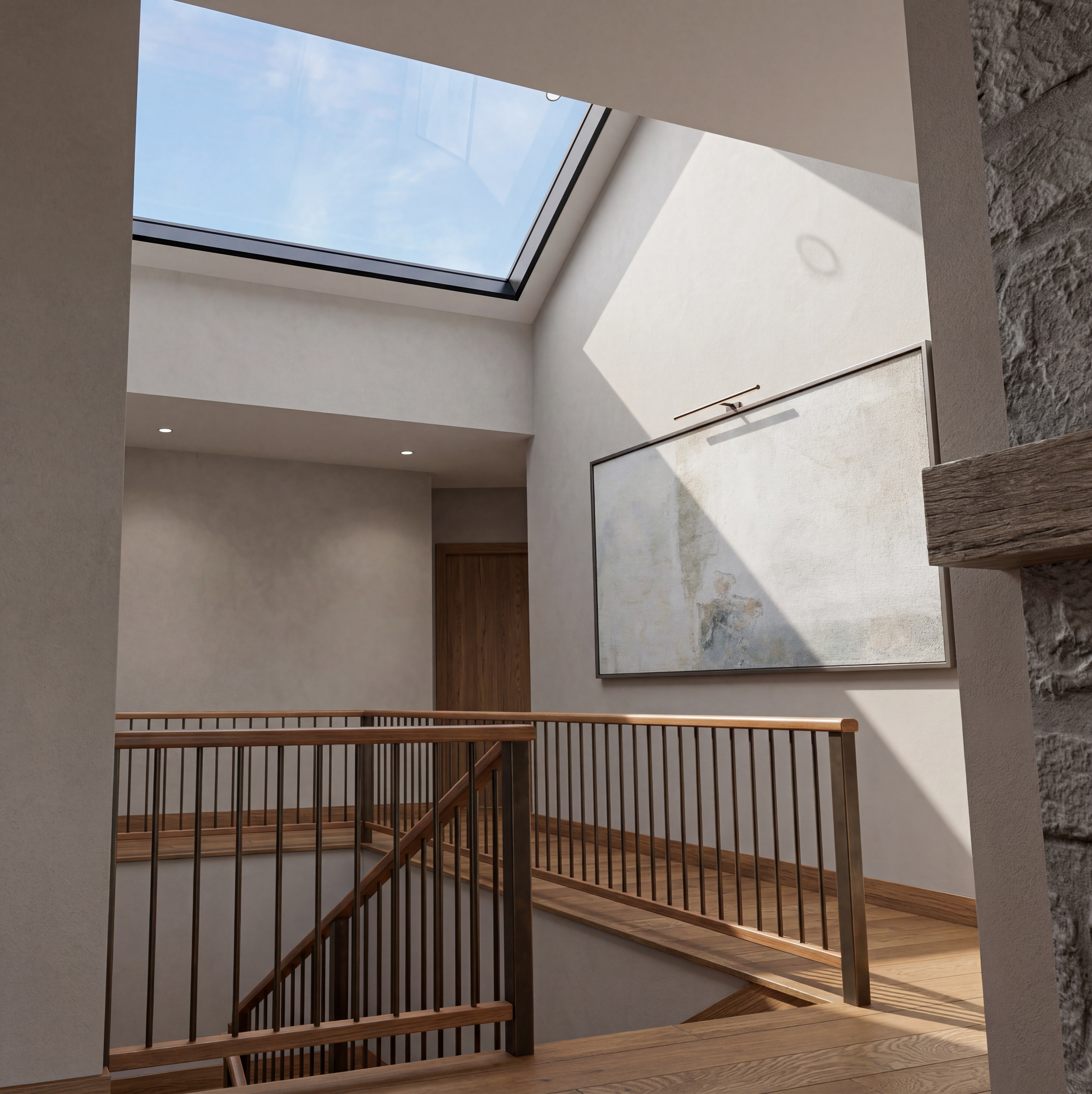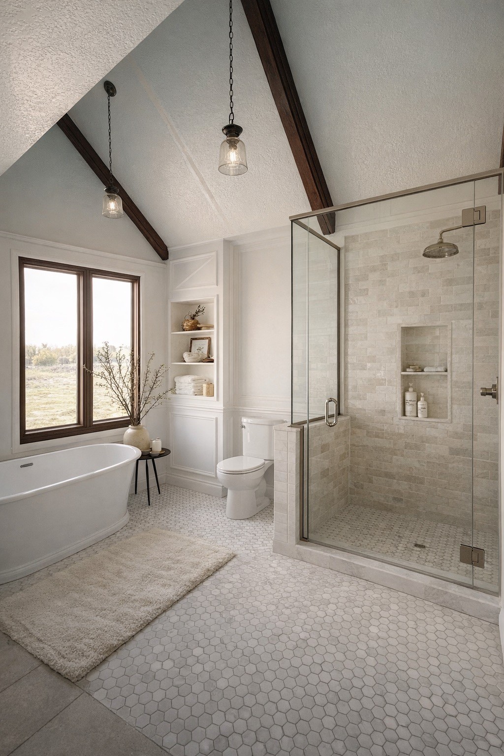 maintain the structure and only do the following add another wood beam in between the existing ones same shape size relative location equally spaced remove the toilet move the tub to be centered under the window add a lower cabinet on the other side of the half shower wall cabinet color pearl white