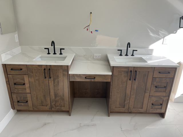 preserve the exact cabinet layout dimensions proportions door styles hardware placement and all architectural features do not change the design geometry colors materials or lighting direction only enhance clarity edges smoothness shadows and subtle realism while keeping the original look completely unchanged add a mirror above the countertop add a chair to sit and do your makeup on stage the countertop