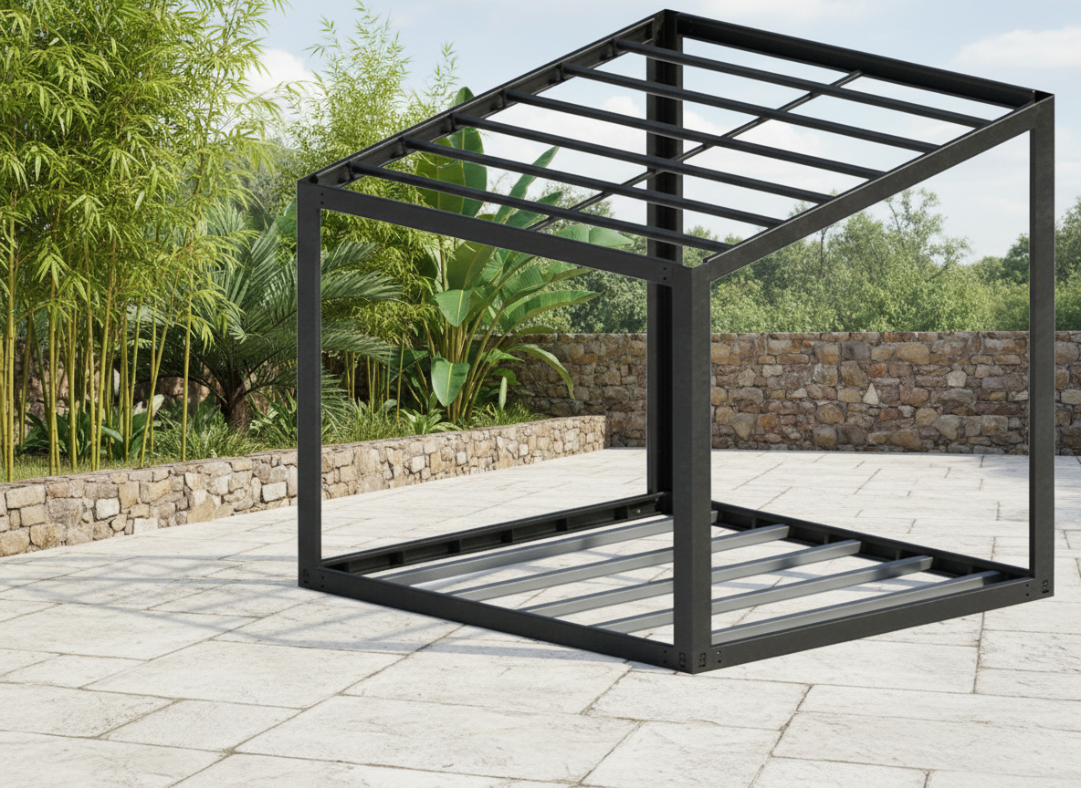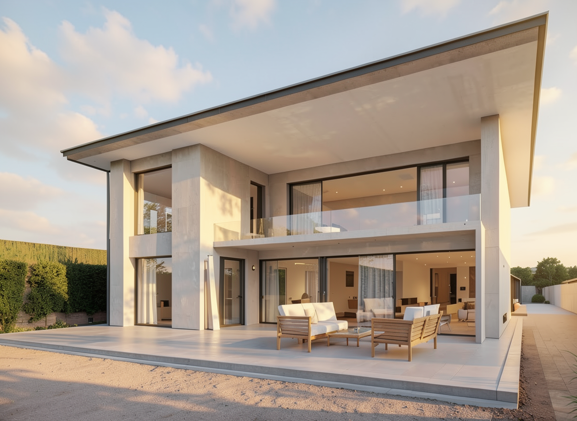 render a modern office entrance with a sleek minimalist design use matte black and dark gray for the walls and ceiling to create a sophisticated look incorporate a vibrant deep blue accent wall on the right to add contrast and interest design a wooden slat feature on the inside entrance wall with a natural oak finish for warmth and texture add a glass door with a chrome handle for a sleek aesthetic the floor should have smooth polished light gray tiles for a clean contemporary feel illuminate the space with soft white lights for a welcoming and professional atmosphere a blue sky and parking lot with landscaping occurs outside the window in the back