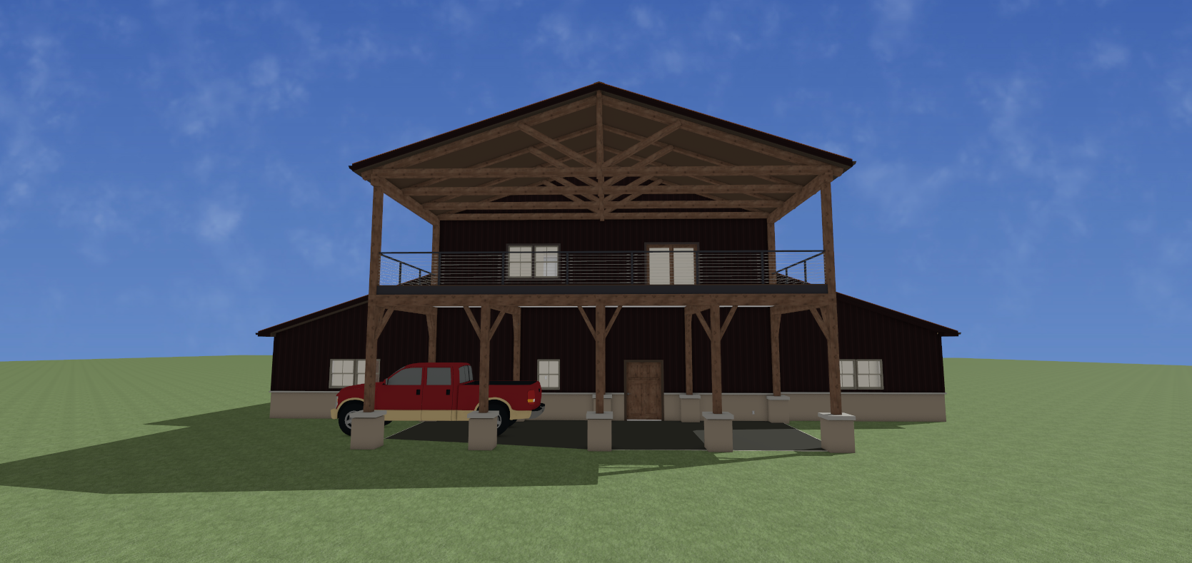 photo realistic high resolution architectural rendering of a two story barn style house with dark vertical siding large front porch upper balcony exposed heavy timber trusses and structural wood posts on concrete bases retain the exact proportions layout and details of the original design centered front door upper double windows with balcony railing side wings with windows and the red pickup truck parked under the porch maintain the roof geometry beam structure railing style window placement and overall scale replace the background with a lush dense forest filled with tall trees sunlight shines through the branches creating bright natural rays soft highlights and warm ambient glow across the house and landscape ground remains grassy and open in the foreground ultra sharp textures realistic lighting natural shadows and true to scale architectural accuracy