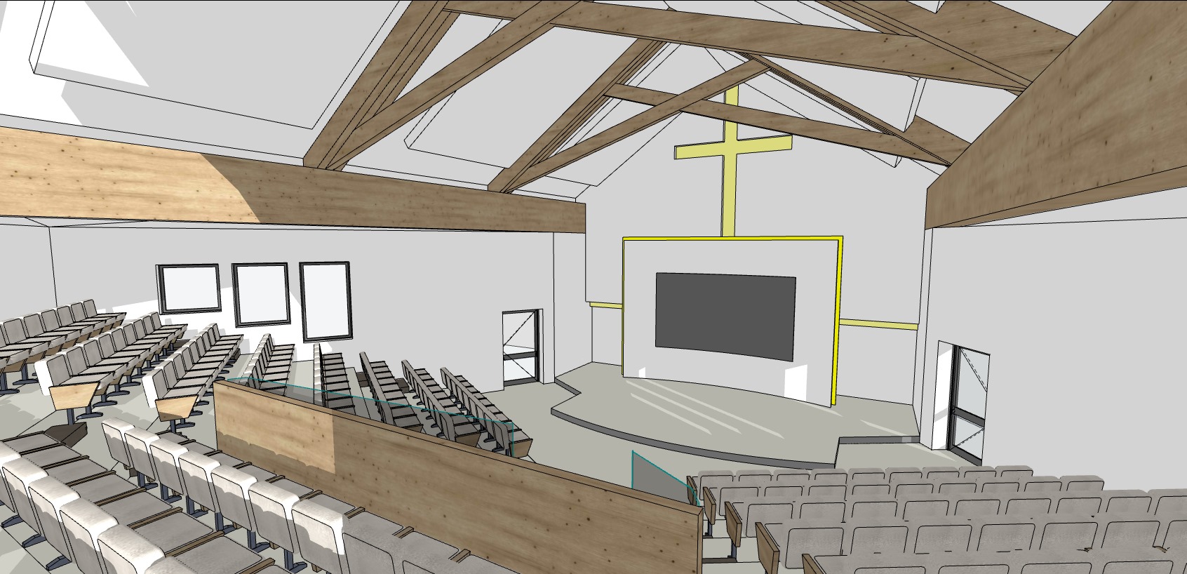 create a hyper realistic architectural render preserve the exact architecture camera angle seating layout stage roof shape wall proportions and exposed wooden trusses do not redesign the space do not add or remove objects keep the spatial configuration unchanged transform all yellow highlighted elements into subtle warm white built in architectural lighting the cross behind the stage should be softly illuminated not too bright the highlighted lines around the stage should become recessed hidden led light reveals with soft indirect light not neon keep the white gypsum ceiling volumes and add recessed spotlights plus very subtle hidden backlighting replace the floor with light beige carpet keep the walls clean warm white keep all wood elements as natural wood with realistic timber texture the black rectangle must remain a flat led church screen with a realistic pentecostal worship or sermon slide use realistic built architecture natural shadows soft ambient light warm white 3000k and avoid futuristic glow or excessive glowing lines