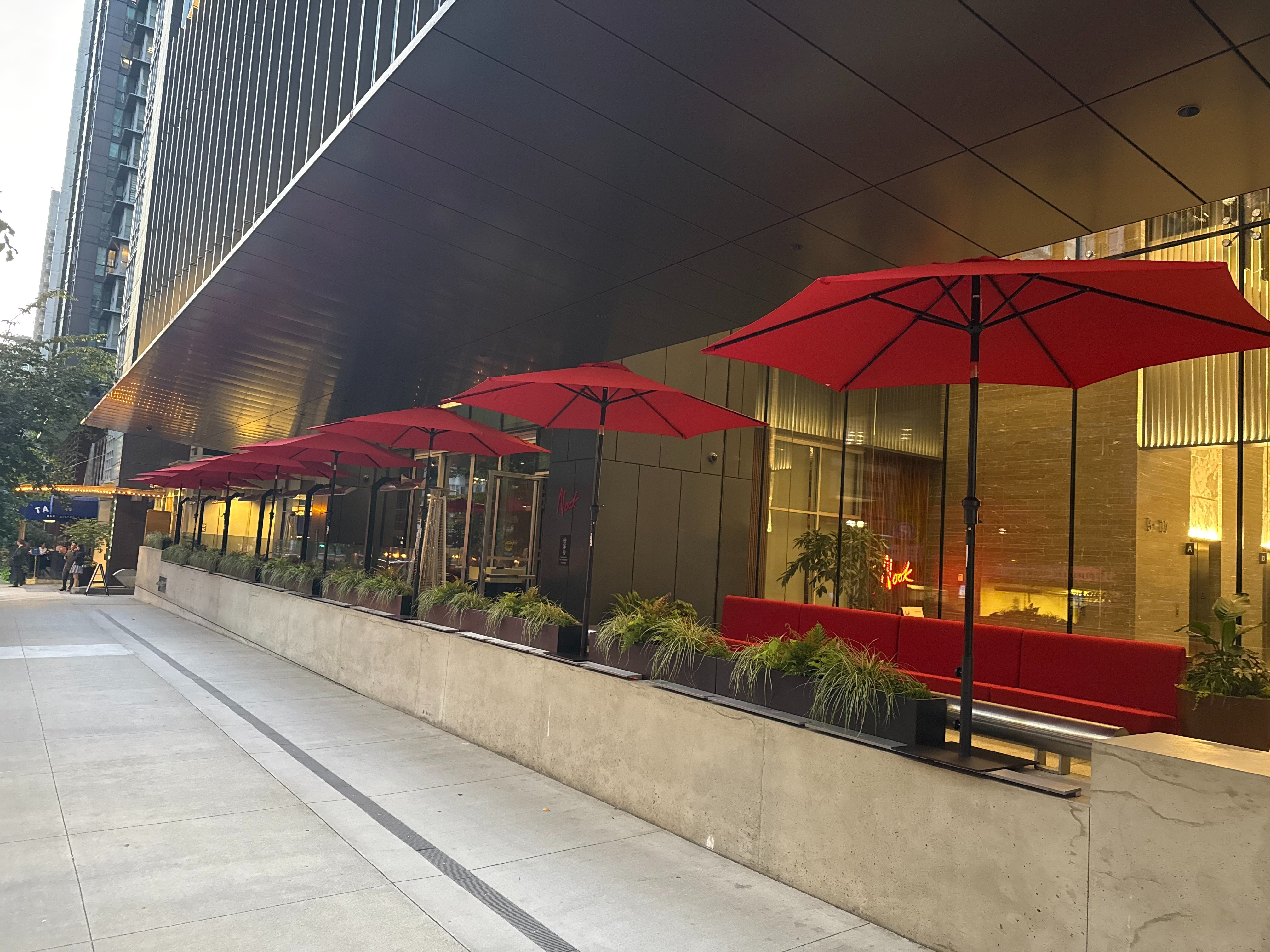 add a sidewalk patio along concrete wall with black rectangle planters beside as a barrier