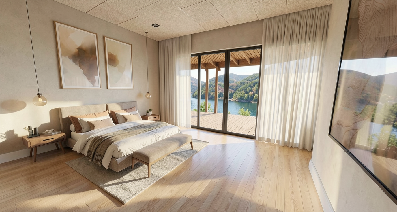 make bedroom look realistic lake front view down the hill behind covered porch wood flooring to be lighter