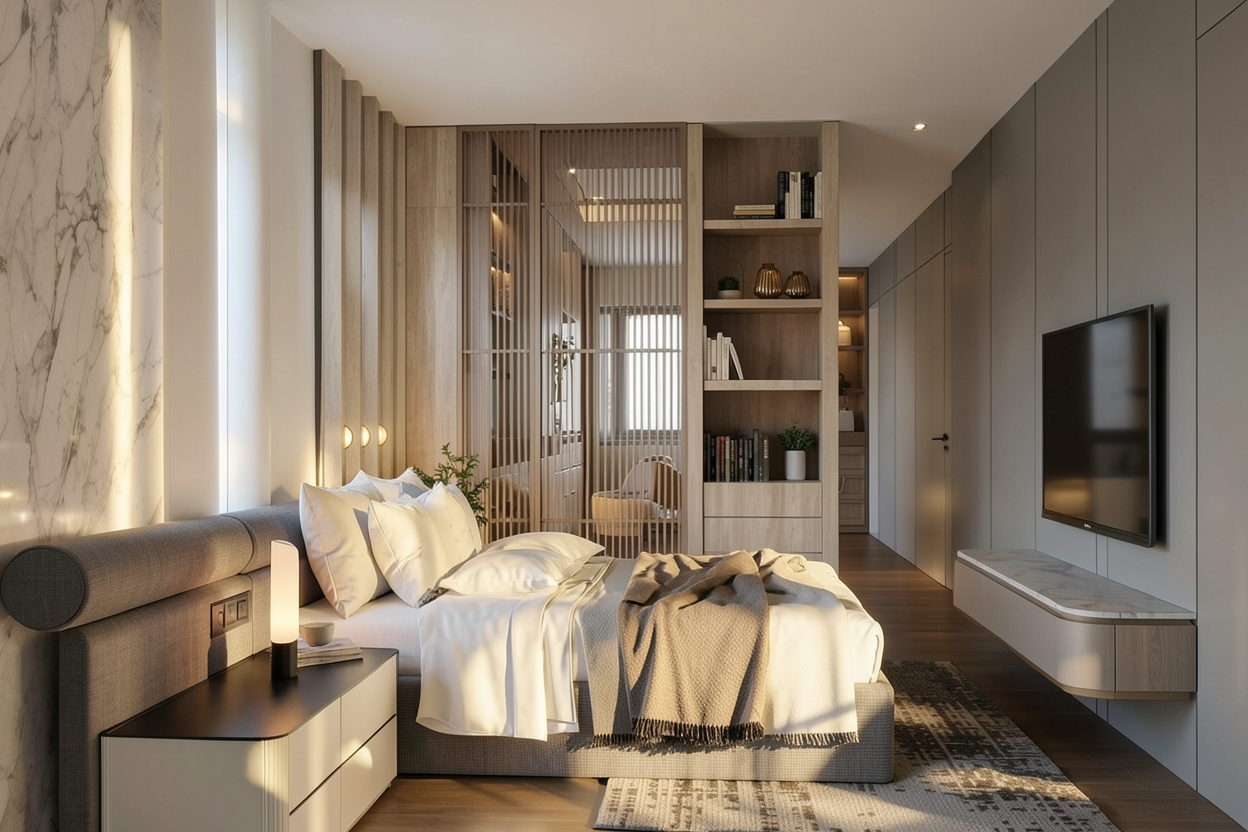 enhance this image to photorealistic 4k quality using hdri rendering do not alter composition proportions materials colors finishes lighting placement camera angle or architectural details do not add remove or modify any objects or features maintain exact design fidelity improve only realism through refined global illumination accurate material textures realistic shadow depth balanced exposure natural light behavior and high resolution surface detail the final result must look like a real photograph of the exact same scene