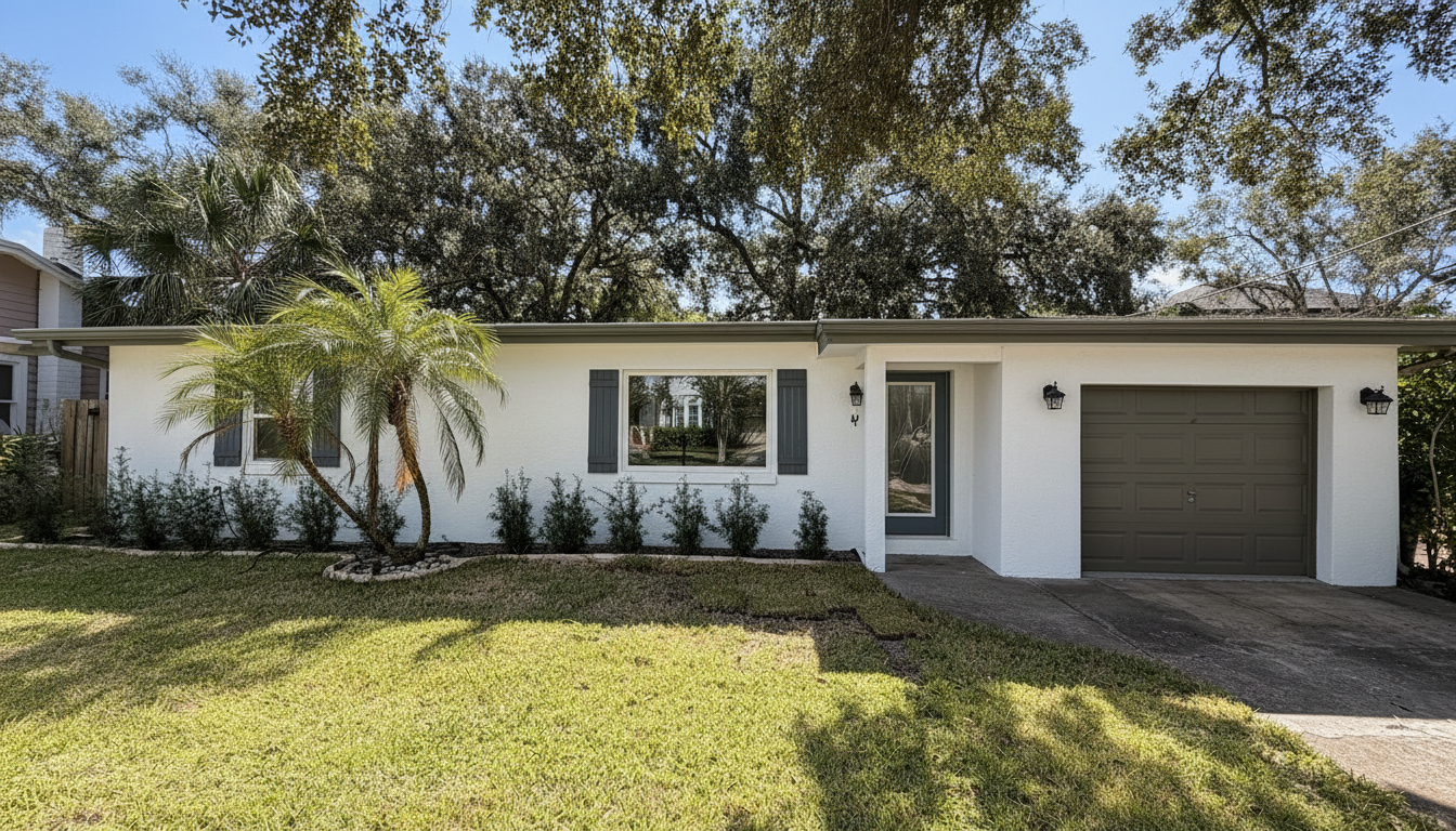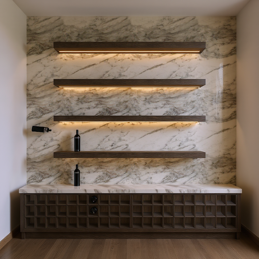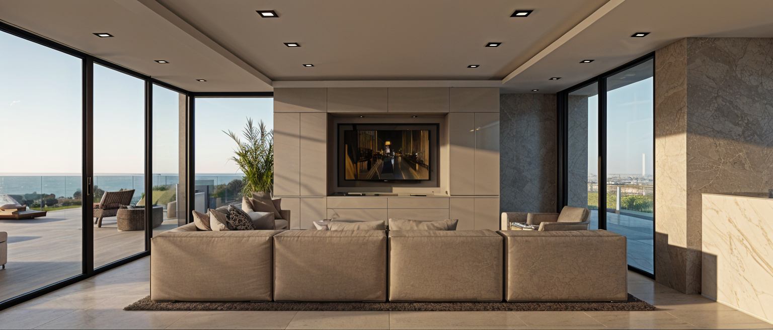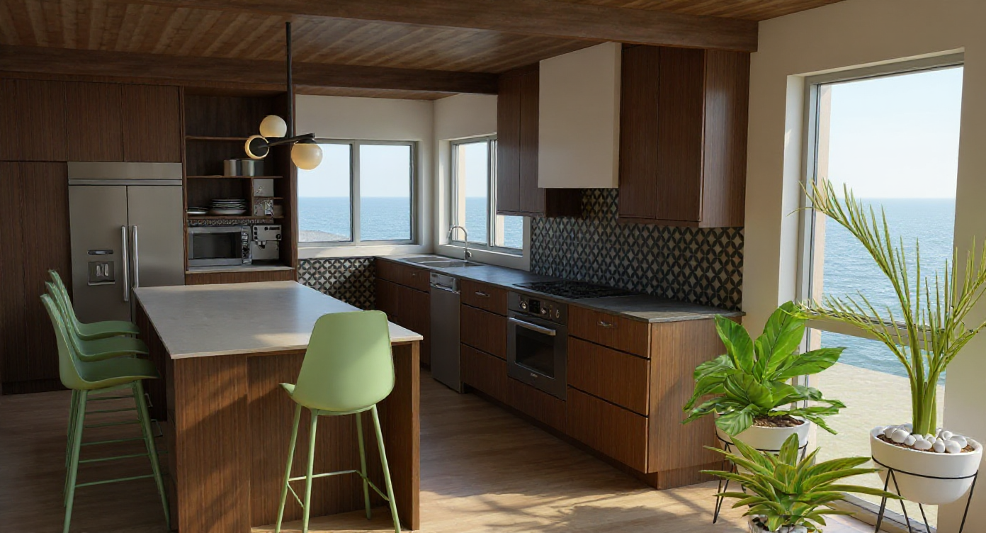make this image as close to a photograph as possible add recessed ceiling lights and no handles on the cabinets natural light sunbeams shadows and a seascape behind the windows