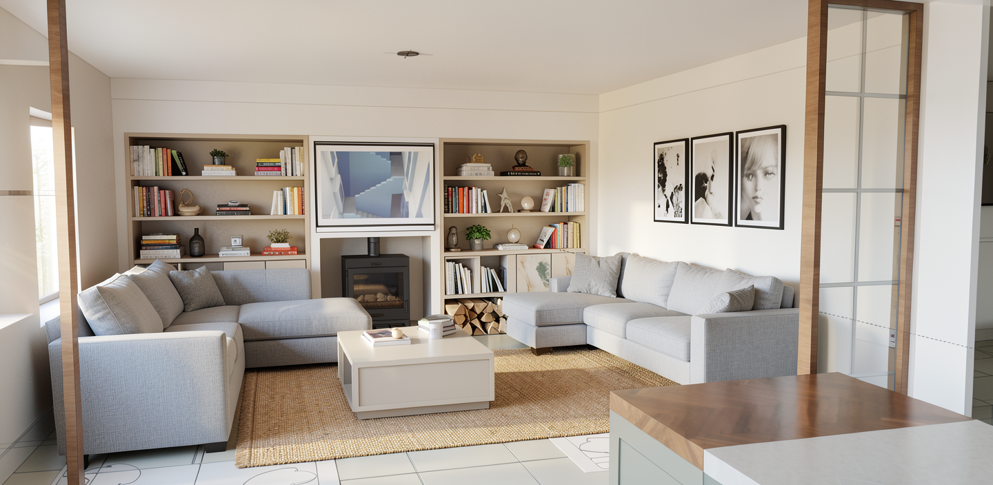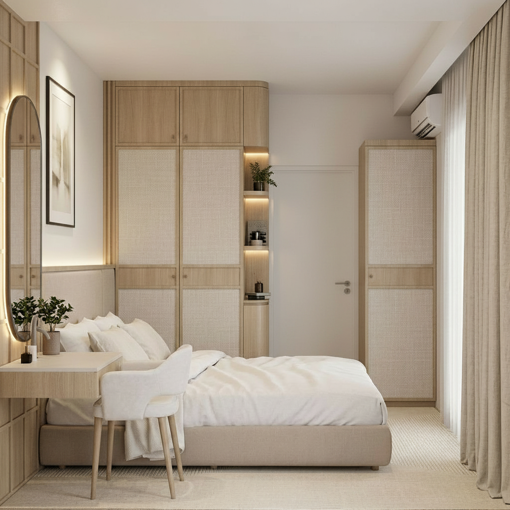 make the wood color a light brown wood and make the ambient render an off white without changing the existing materials and make the bedframe beige fabric