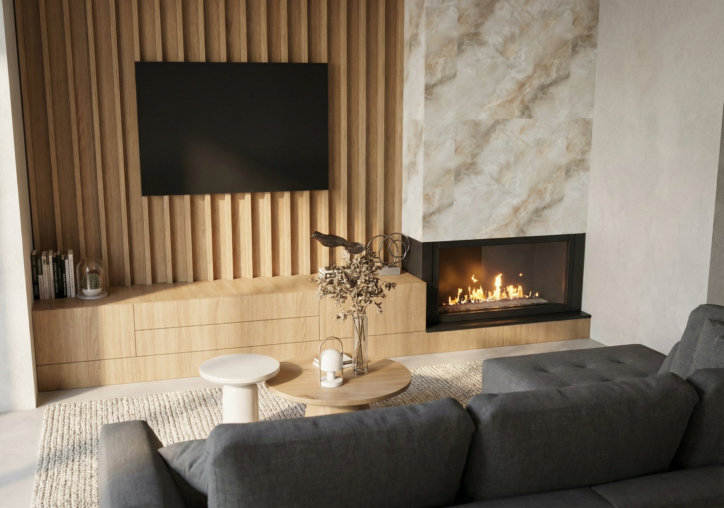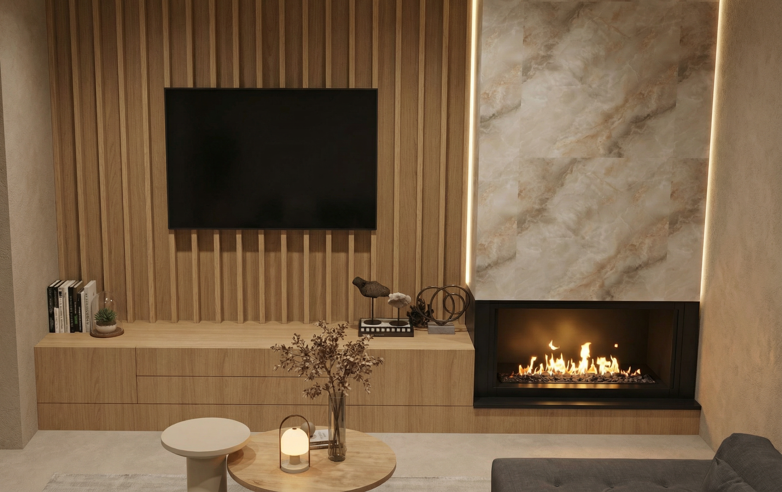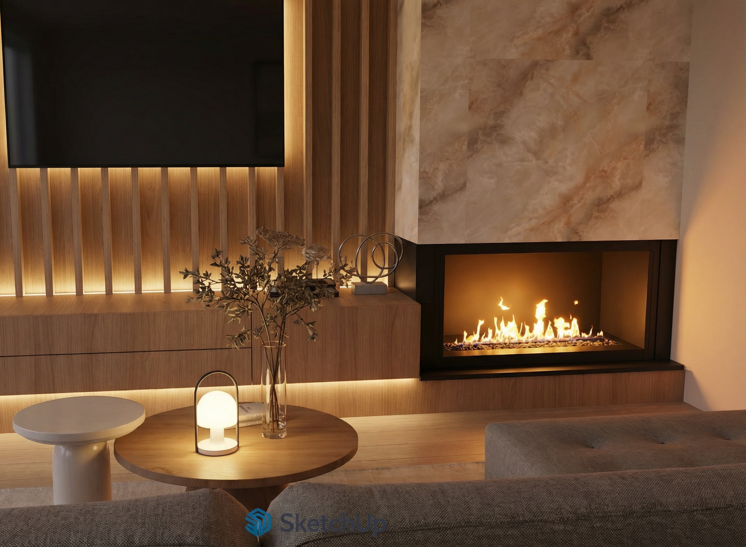 ultra realistic interior render in japandi minimal style based strictly on the provided sketchup geometry do not add remove or modify architectural elements preserve the exact layout openings and structure lighting evening night time atmosphere no daylight scene is illuminated only by existing artificial light sources within the model soft warm ambient lighting 2700k 3000k including indirect lighting concealed led strips table lamps or ceiling lights if already present do not add new light fixtures light quality low intensity diffused glow soft shadows gentle falloff cozy and intimate atmosphere subtle contrast with slightly darker corners realistic light bounce materials warm neutral japandi palette light oak wood beige tones soft greys textured plaster matte finishes and natural fabrics furniture low profile japandi style simple forms minimal and refined styling add a small number of carefully curated decorative elements keep styling minimal and intentional not cluttered materials for decor ceramic wood linen stone in neutral tones only placement balanced composition with negative space preserved do not overcrowd surfaces camera eye level perspective 35mm lens photorealistic textures global illumination ray tracing high dynamic range soft depth of field mood calm cozy intimate refined minimalism quiet luxury evening relaxation atmosphere no additional windows no new openings no added light fixtures no clutter no bold colors