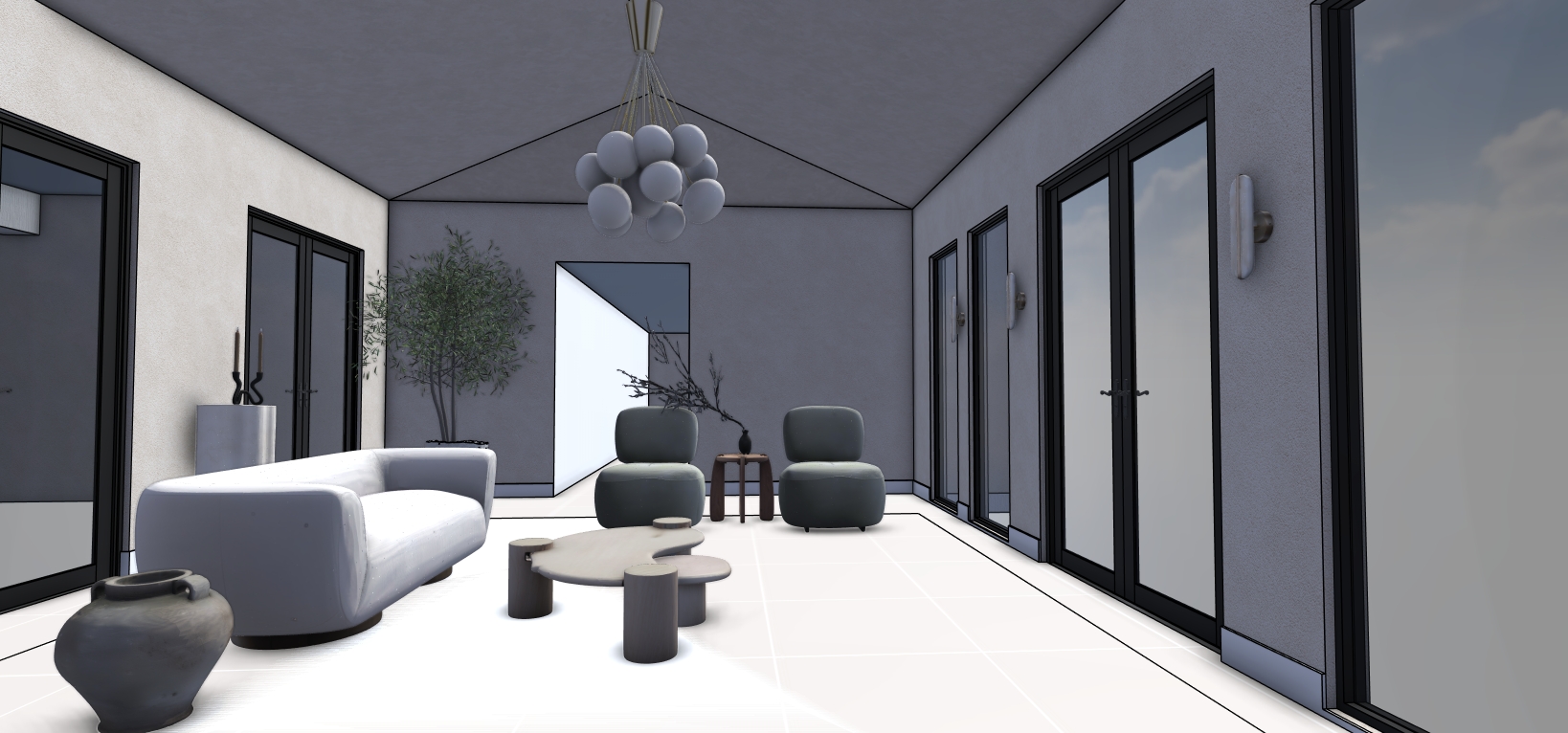 create a modern and elegant living room interior the walls are a subtle light gray contrasting with a clean white ceiling floor is tiled in a polished white include a sleek white sofa with soft curves positioned near a minimalist light wood coffee table with rounded edges two comfortable dark green armchairs are placed adjacent surrounding a small dark brown side table add a modern spherical pendant light fixture in soft gray hanging from the ceiling to the left place a large earthy black vase decorate with a tall leafy green plant in a simple pot enhancing the fresh inviting atmosphere the room is bordered with wide floor to ceiling black framed glass doors showcasing a view of a bright sky blue day with fluffy white clouds allowing natural light to pour in and create a serene ambiance