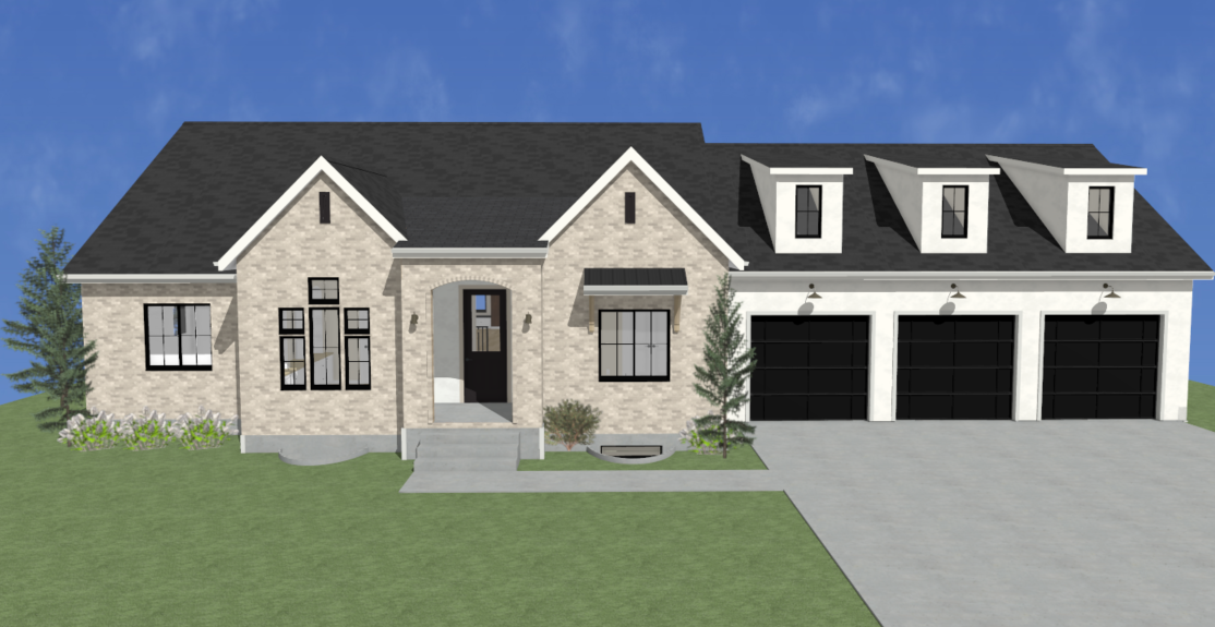 a charming creamy brick house with black accents bronze light fixtures on the exterior white soffit and fascia creamy neutral colors a manicured lawn with scattered pine trees and mountains in the back native plants found around the property