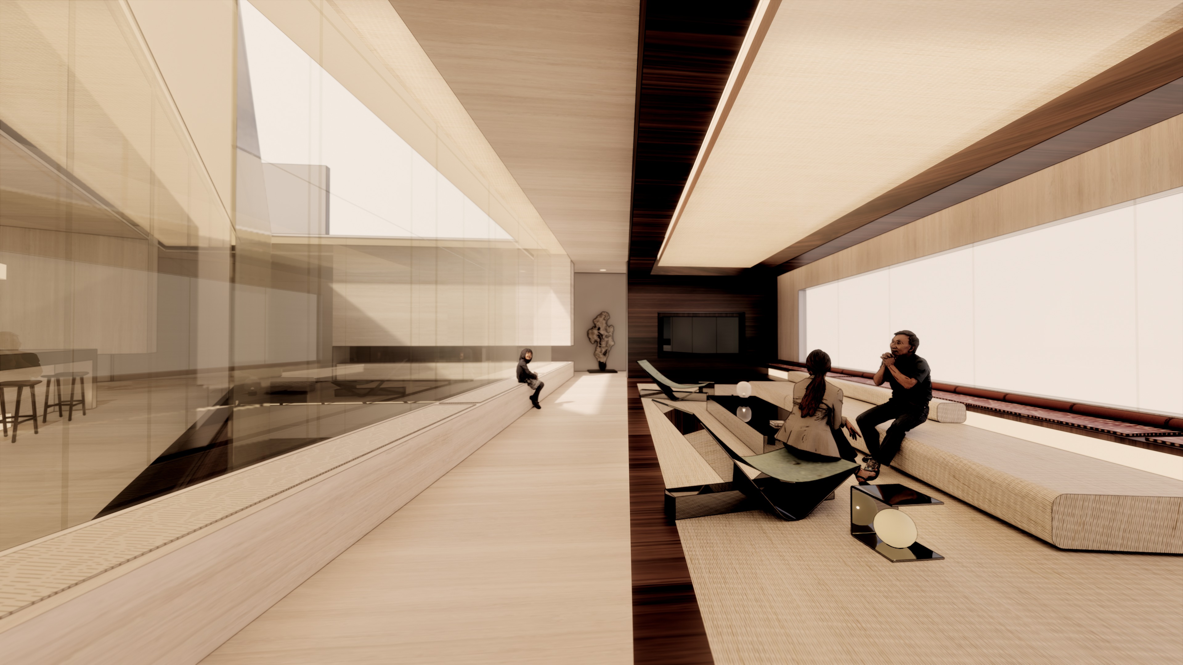 refine this interior rendering to match the lighting mood and color tone of a warm high end omakase environment maintain the exact composition geometry materials and furniture do not add remove or redesign any elements lighting adjustment reduce overall brightness and eliminate harsh or flat lighting introduce a warmer more ambient lighting tone soft golden warmth increase contrast slightly to create depth but keep transitions smooth and diffused emphasize indirect lighting and glow rather than direct illumination atmosphere mood shift the space toward a more intimate moody and evening like ambiance avoid overexposure especially on walls ceiling panels and floor create a calm immersive and softly lit environment consistent with luxury hospitality interiors color grading slightly desaturate bright whites and beige tones warm up the overall palette while keeping it neutral and refined ensure consistency with other renderings that use warm soft and cohesive tones material read do not change materials improve how materials respond to light fabrics should appear softer and more matte wood should feel richer and less reflective do not alter actual material types or colors only adjust how they are lit important constraints do not change layout architecture furniture or objects do not add lighting fixtures or decorative elements do not restyle the space only adjust lighting and atmosphere