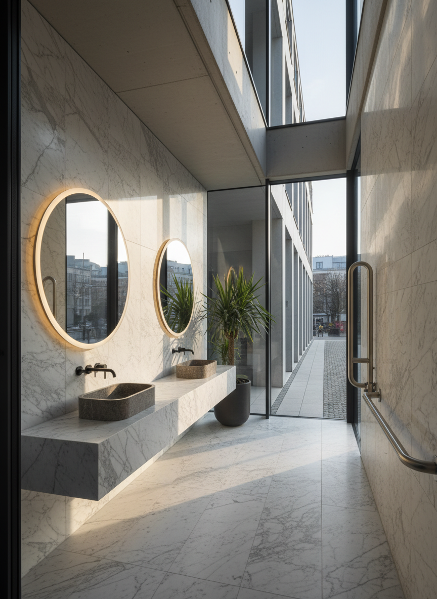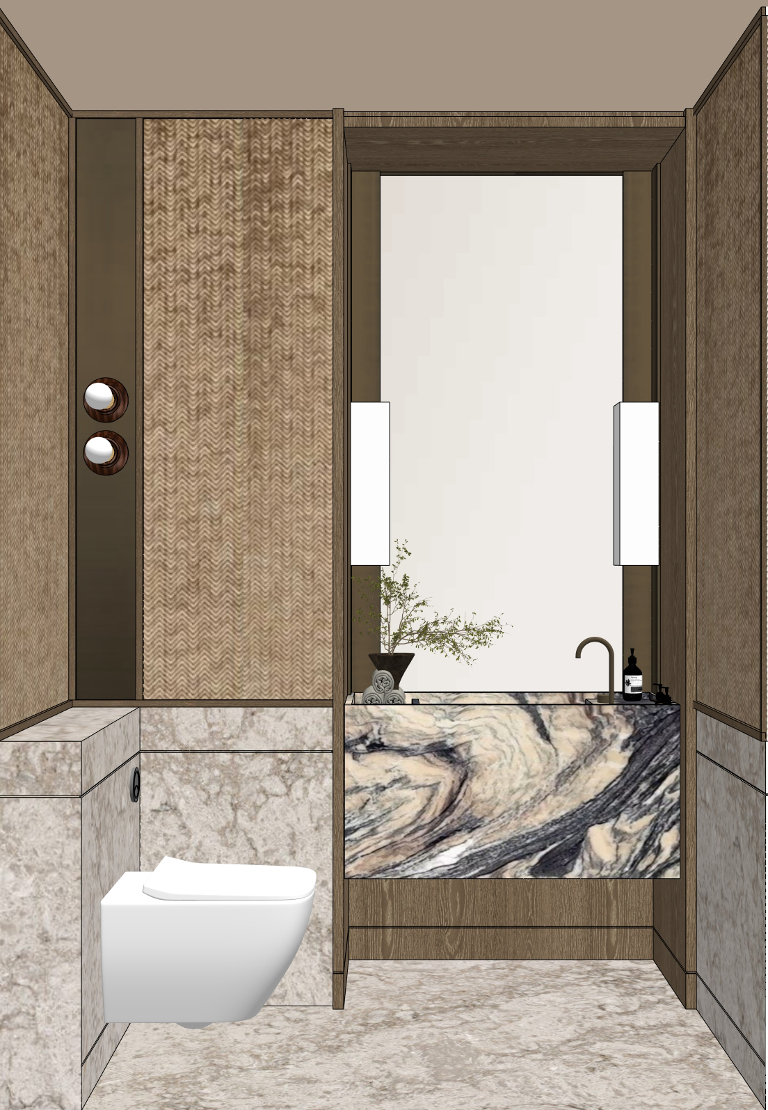 bathroom interior interior lighting temperature 3000k no natural lighting moody ambient bronze metal trims bronze faucet honed finish marble textures