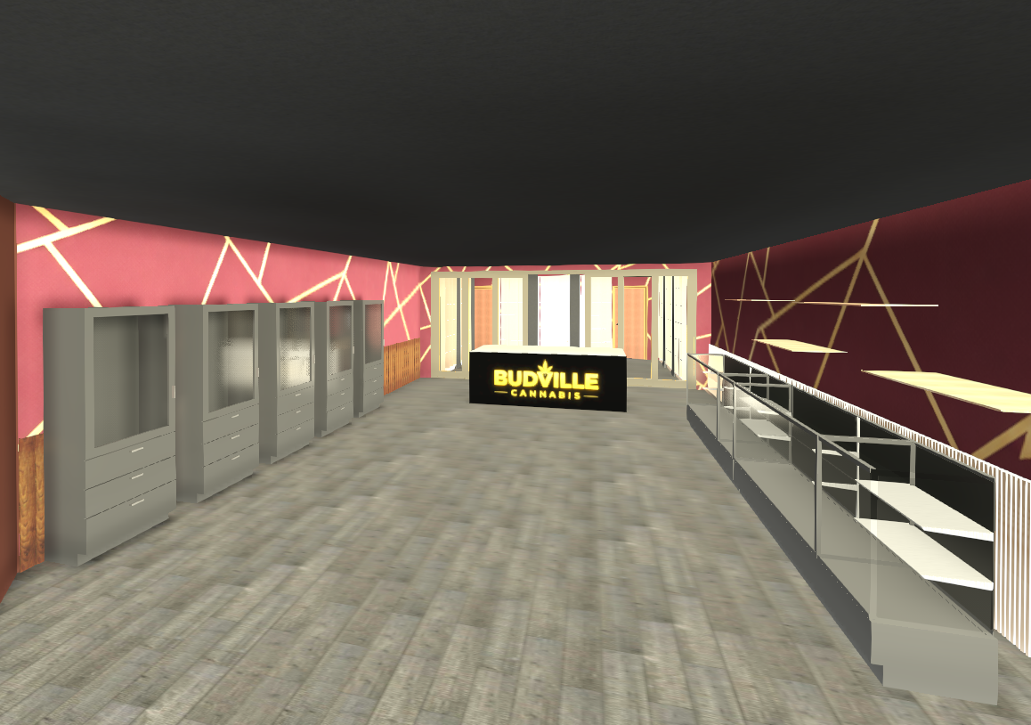 ultra photorealistic architectural visualization of a budville cannabis retail dispensary interior using the provided reference image as the exact base geometry and layout maintain the exact camera angle room proportions counter placement display shelving layout circulation path ceiling form wall positions doors and product cabinets exactly as shown in the reference image transform the scene into a high end photorealistic retail interior render while preserving budville cannabis branding materials and colors exactly strict material and color requirements do not alter walls must remain deep burgundy wine red walls must contain thin metallic gold geometric line patterns exactly like the reference lower wall panels must remain vertical walnut wood slat paneling main retail counter must remain matte black with illuminated warm yellow budville cannabis logo flooring must remain light oak warm walnut wood flooring shelving and millwork must remain black ash wood metal accents must remain gold brushed brass color palette must remain burgundy red gold walnut wood matte black warm lightingdo not change colors do not introduce new materials do not recolor surfaces only improve realism lighting and texture quality enhancements to add realism realistic wood grain on walnut panels and shelving polished matte black retail counter material realistic glass display cabinets integrated warm led shelf lighting cannabis product jars and retail packaging on shelves soft indirect lighting reflections subtle greenery plants for atmosphere premium retail dispensary presentationlightingwarm 3000k retail lighting recessed ceiling spotlights soft ambient bounce lighting accent lighting on shelves and counterceilingmodern black linear ceiling with integrated lightingrender styleultra realistic interior architecture render ray traced reflections global illumination cinematic lighting soft shadows realistic materials high dynamic rangecamerawide angle interior architectural photography eye level perspective 24mm lensqualityphotorealistic 8k architectural visualization v ray unreal engine style rendering professional interior design portfolio quality