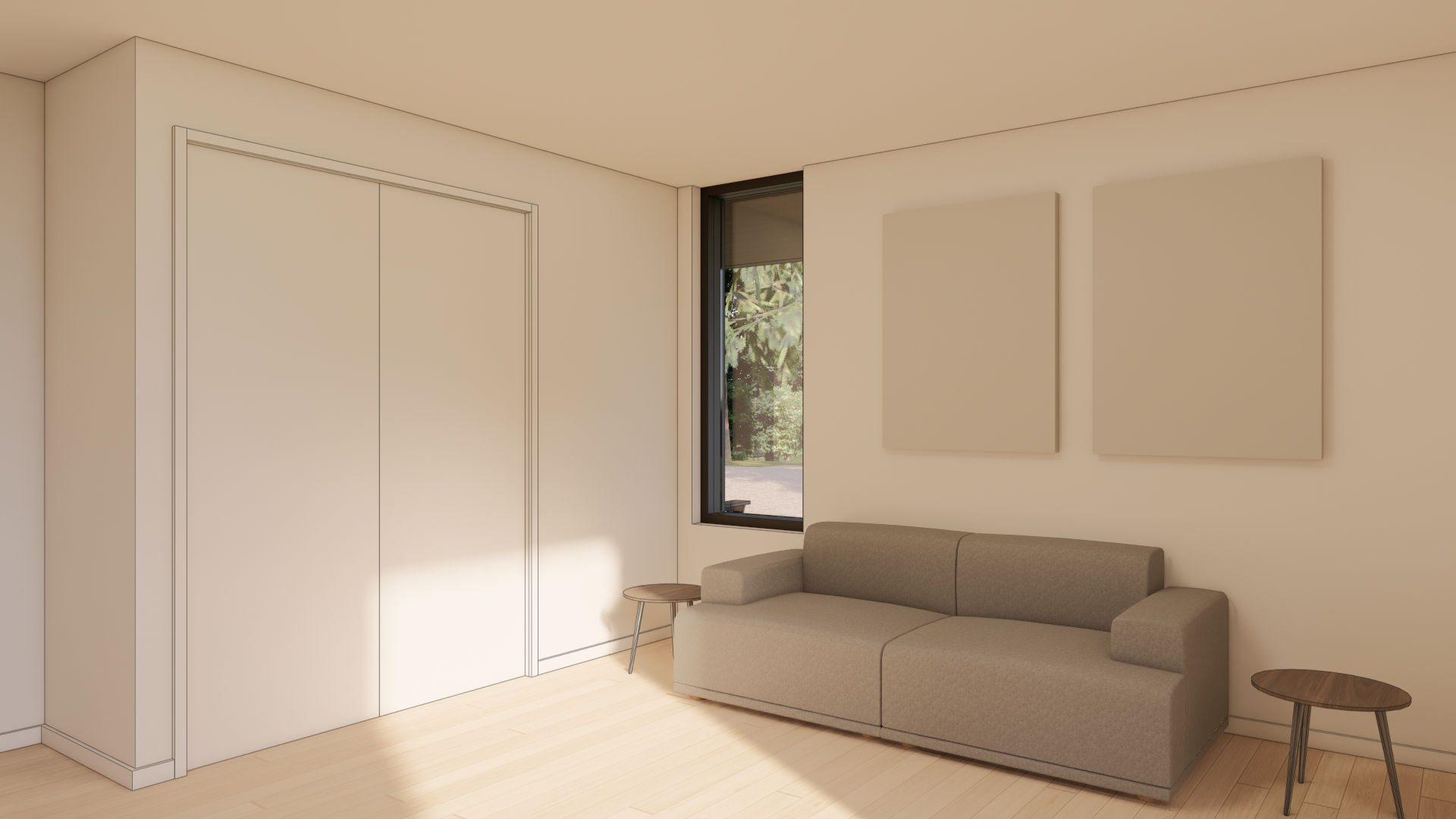 make the couch a pullout bed couch with bedding keep the top of the couch the same shape and color make the two boxes on the wall into paintings paint the walls and doors a dark gray green