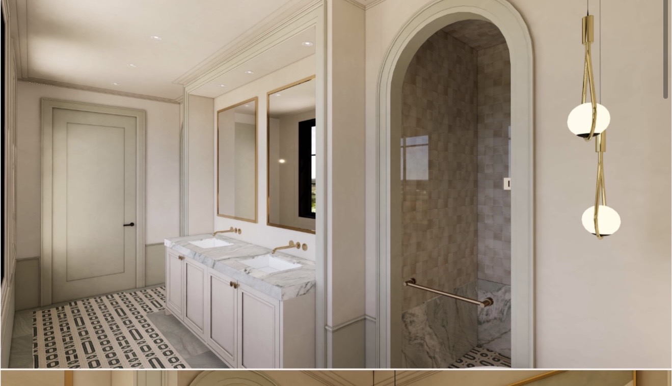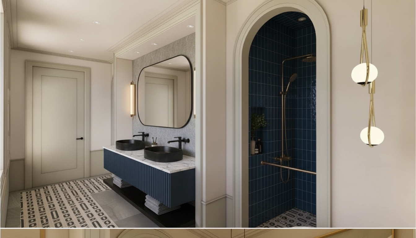 exterior shot design the bathrooom in this style and blue color tone must have a double sink and maintain layout