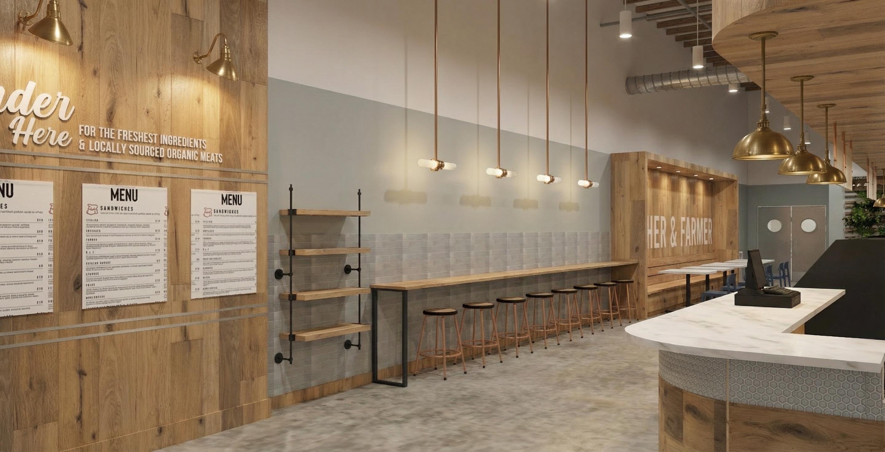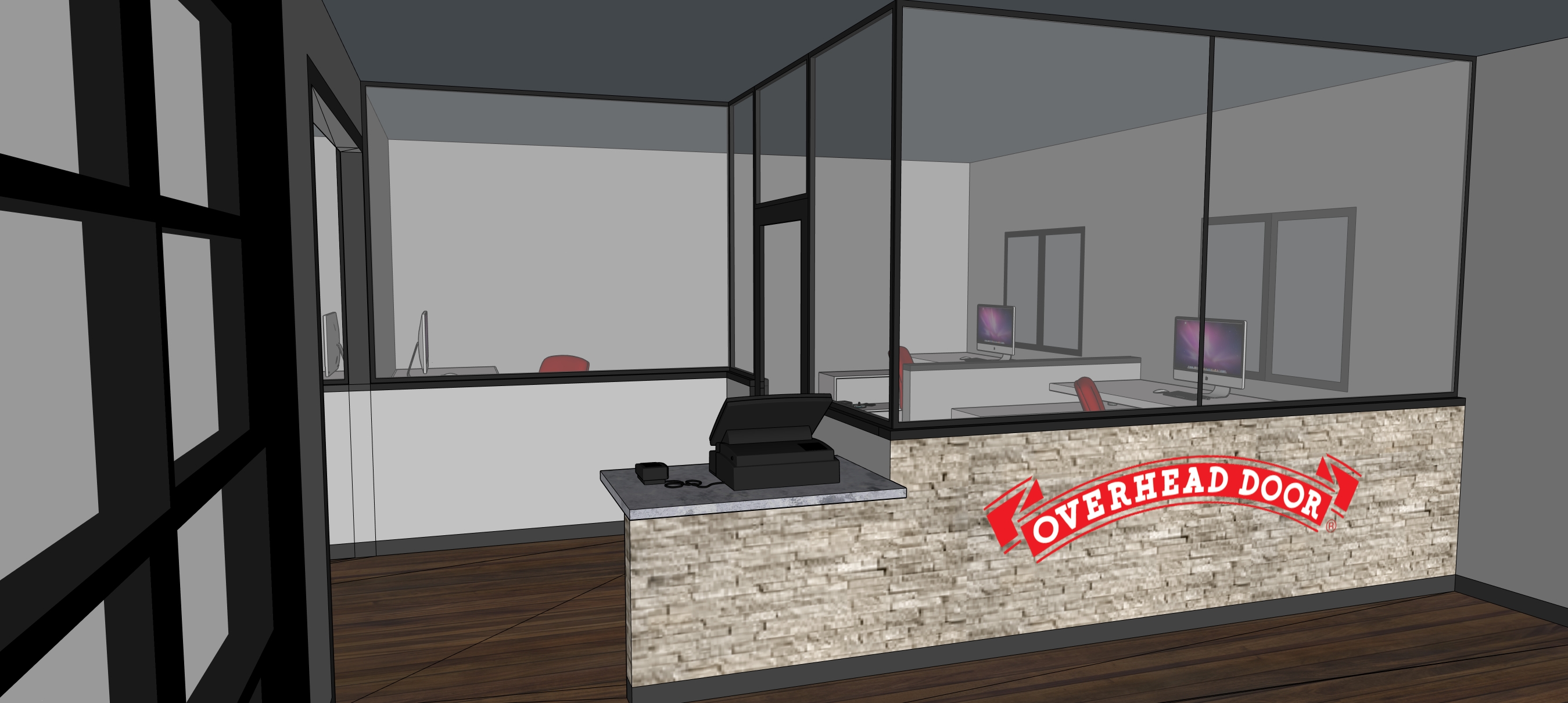 add ceiling can lighting add office decor add people parking lot in background outside windows on right side