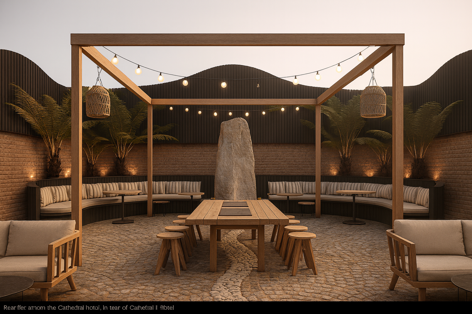 a cozy outdoor lounge with a warm inviting atmosphere at sunset a wooden pergola with hanging rattan lanterns and string lights casting a soft glow rustic stone flooring and walls in earthy tones create a natural feel comfortable stylish seating with light beige cushions complement the polished wooden tables and stools tall green palm trees provide a lush backdrop and a central stone structure adds an earthy focal point the ambiance is serene perfect for relaxing or social gatherings