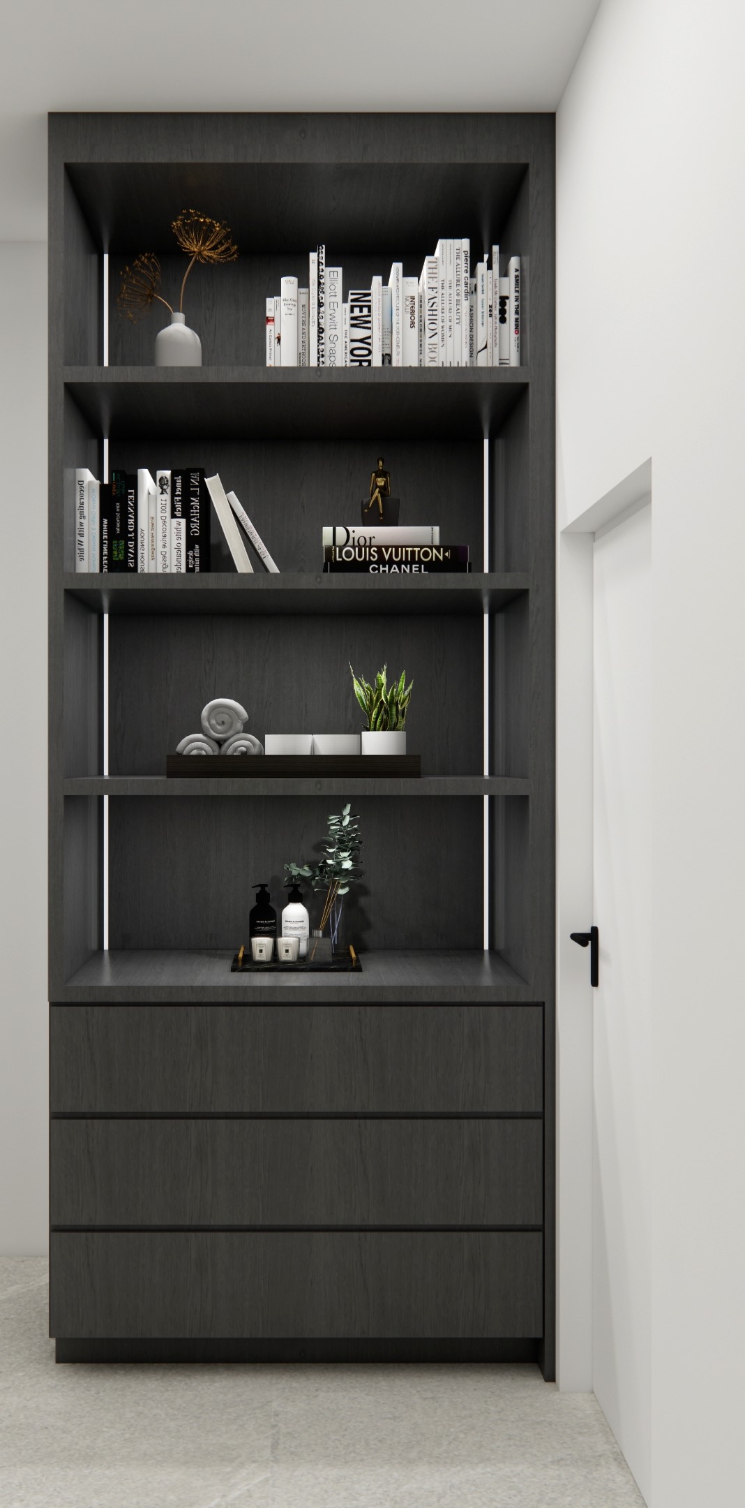 create a hdri photo realistic rendering do not change any image details do not move or modify features add vertical led lights on the back of the shelves