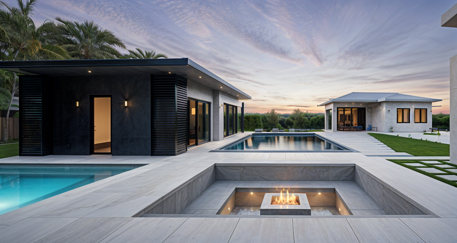 modern exterior shot modern exterior shot black and concrete buildings with black roofs rectangular pool and fire pit in center black fences lush tropical greenery in background grass and smooth porcelain floor architecture architecture architecture