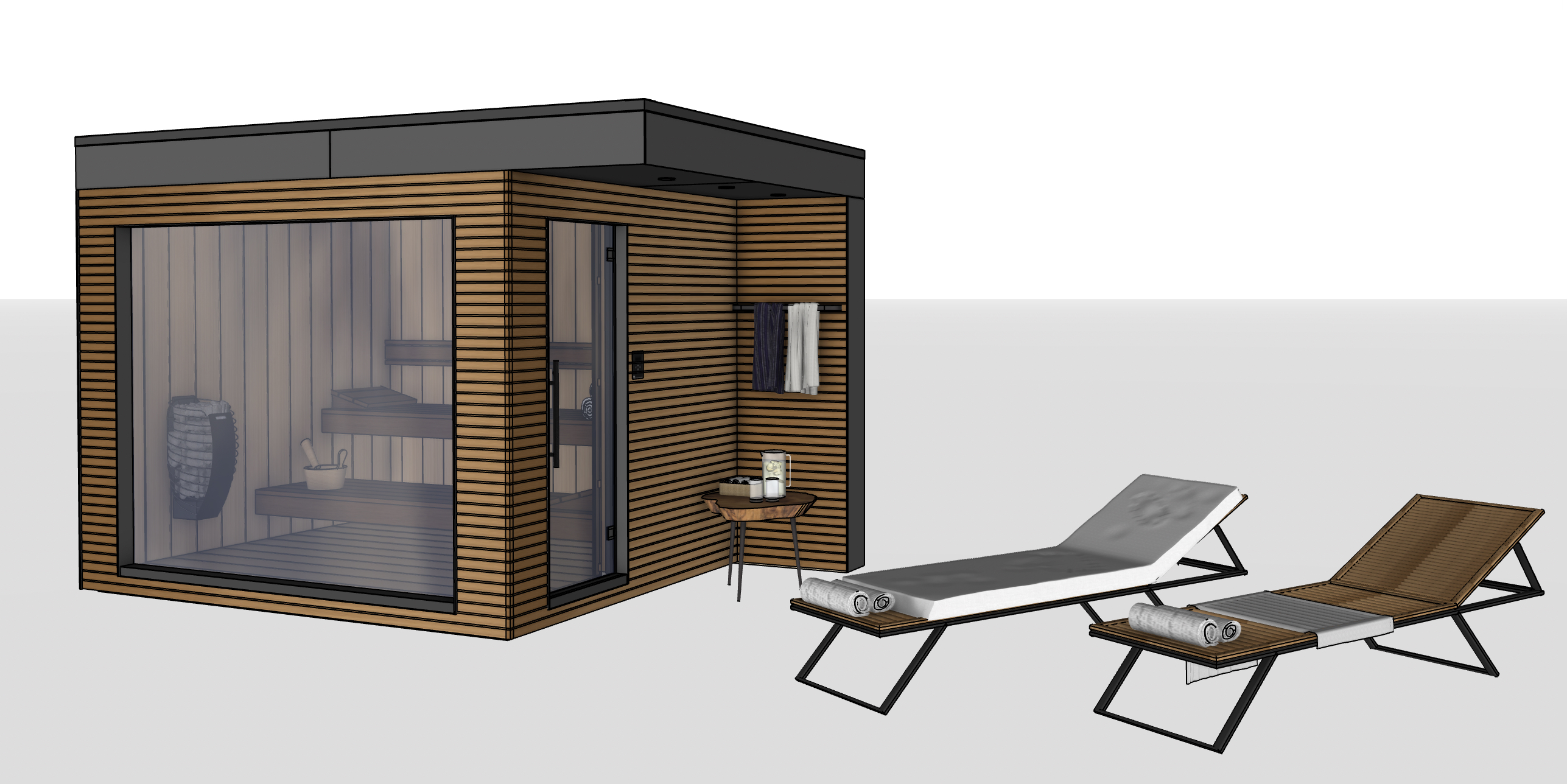 photorealistic render of the exact uploaded sauna model placed in a modern central european czech garden the model is fully accurate do not modify geometry proportions materials layout openings roof benches heater loungers table or camera composition only add realistic environment premium materials lighting reflections and garden context surround it with vegetation commonly used in czech gardens lawn ornamental grasses lavender hydrangeas boxwood hornbeam hedge small ornamental trees and natural planting beds contemporary garden design elegant paving calm residential atmosphere soft late afternoon daylight realistic shadows high end architectural visualization no redesign only photorealistic enhancement