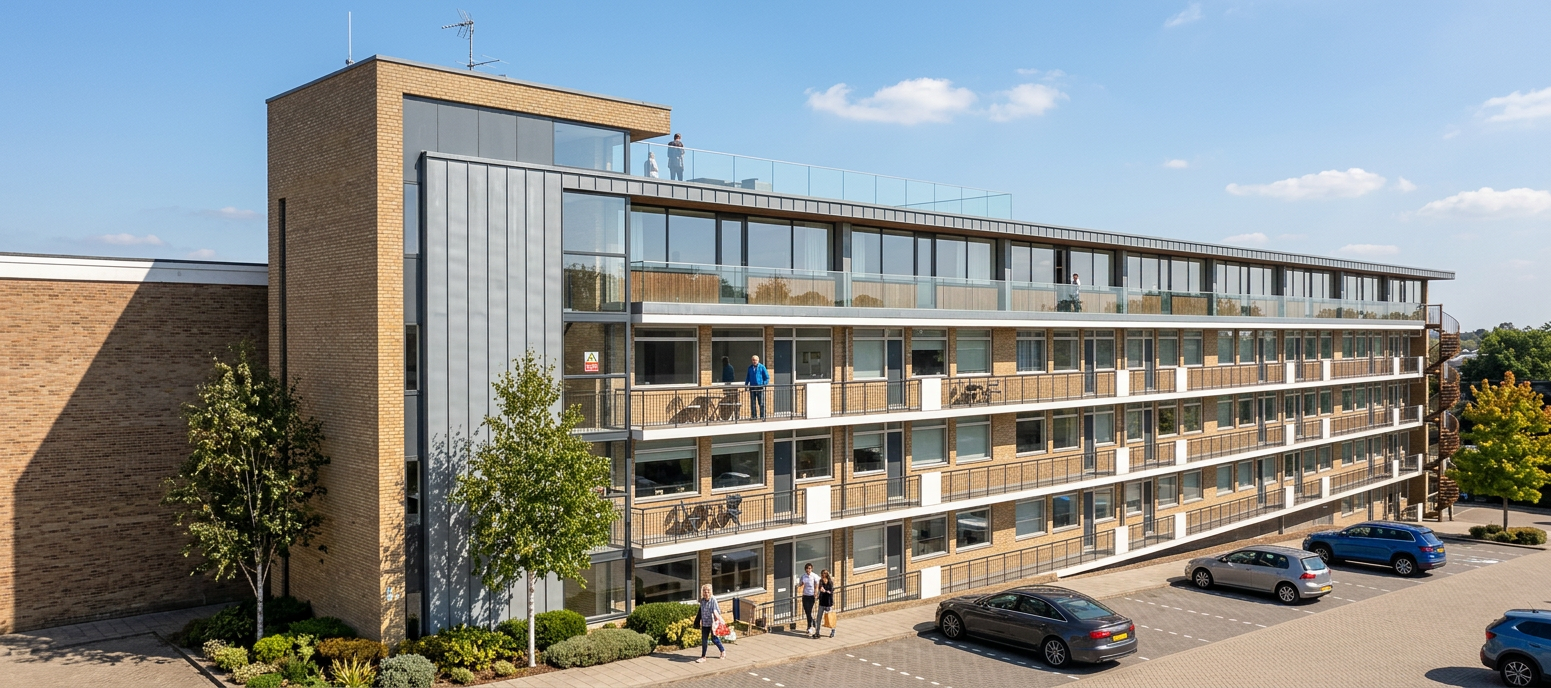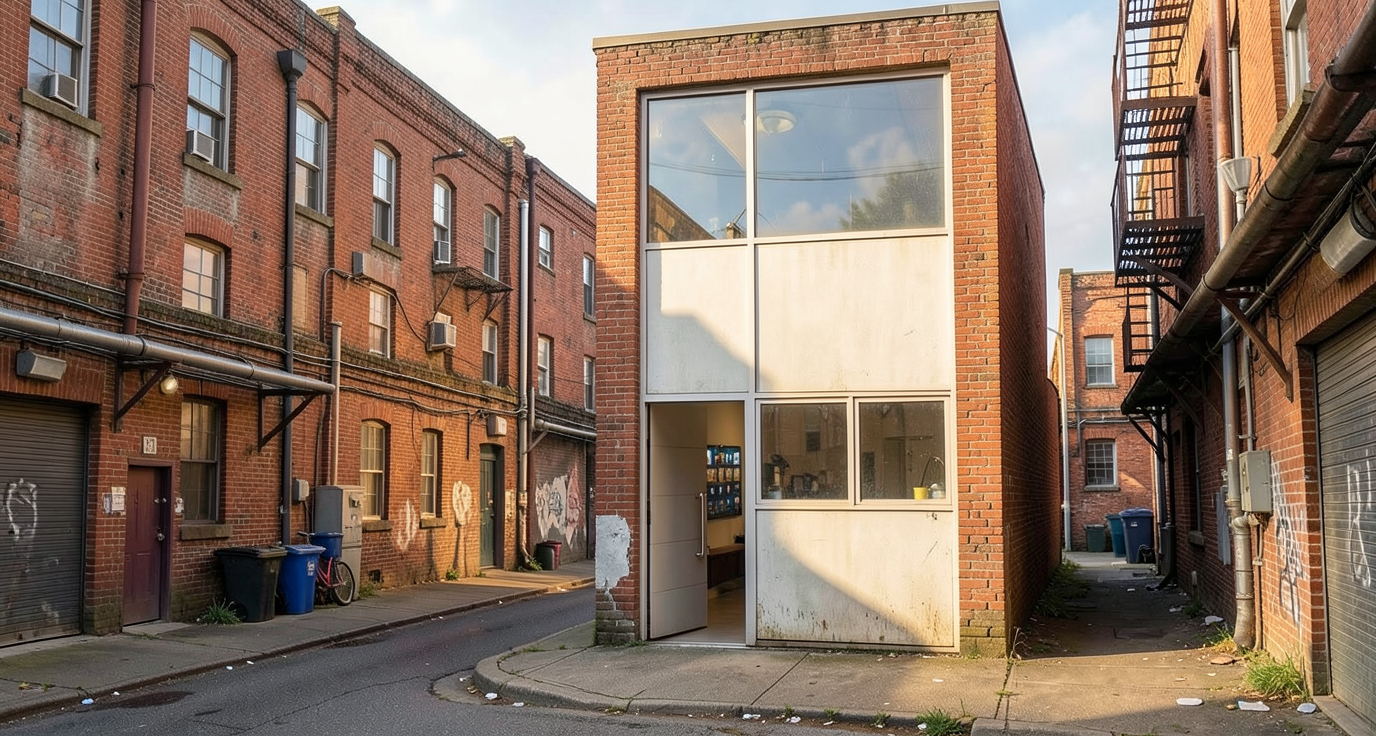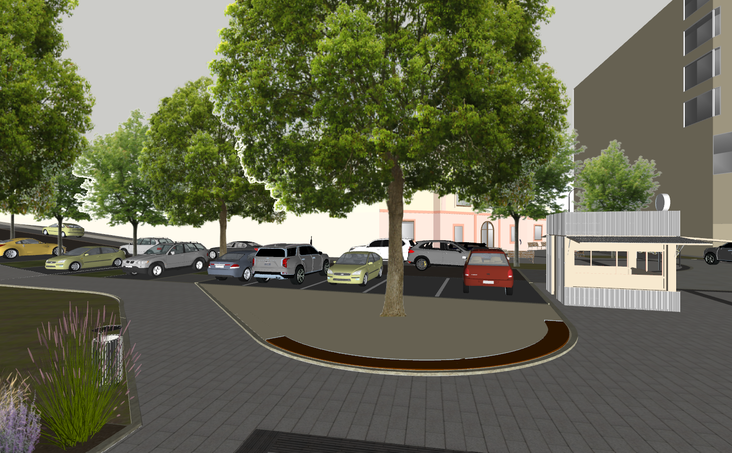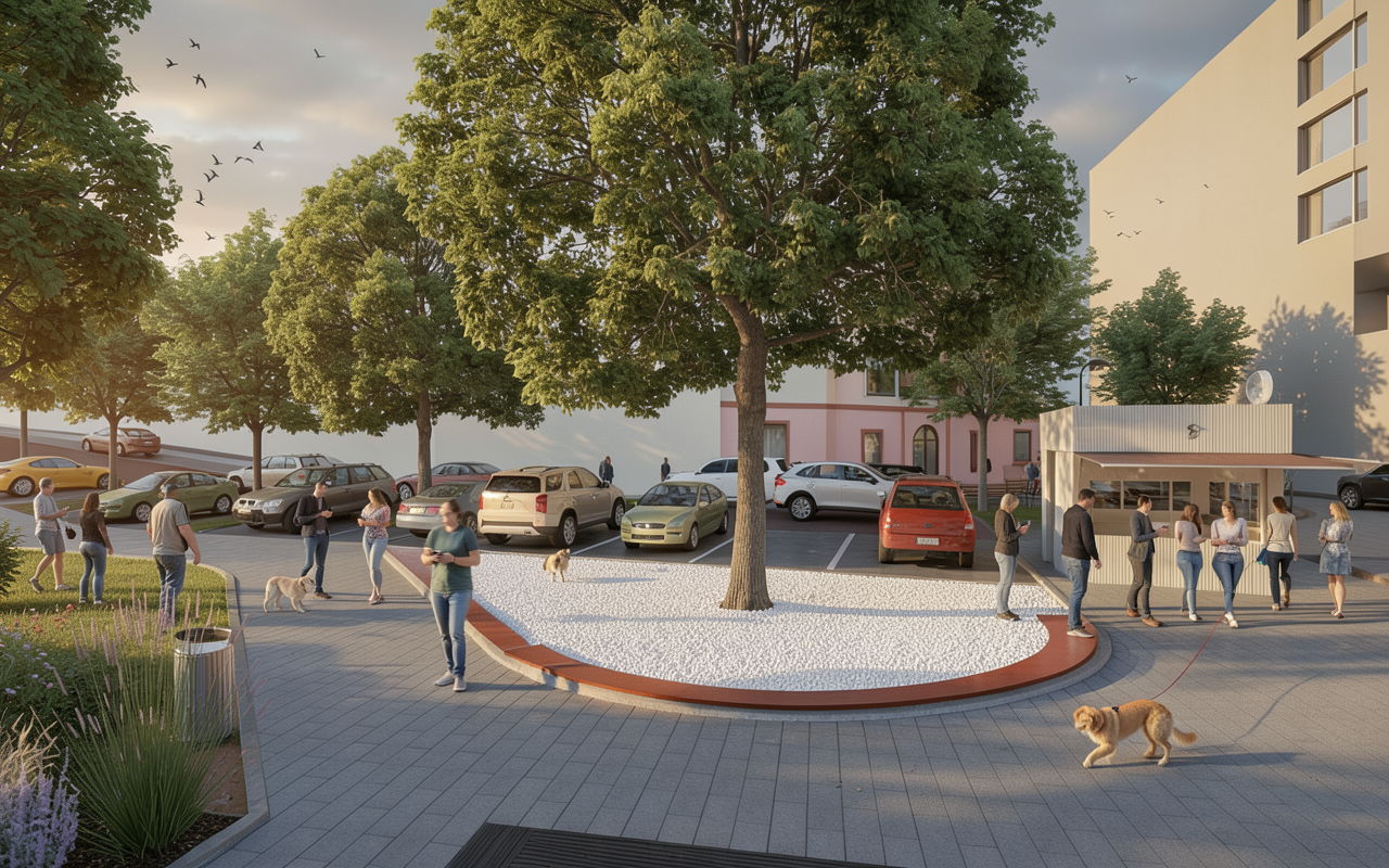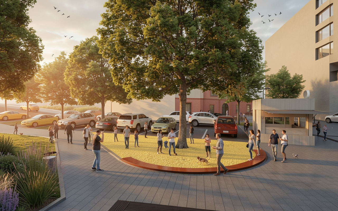 ultra realistic architectural visualization based strictly on the provided raw sketchup view preserve exact geometry proportions camera angle composition and architectural details do not redesign or alter the building enhance only with realism add realistic materials with physically accurate textures natural wood grain brushed concrete glass reflections subtle imperfections micro surface details use high dynamic range lighting with soft global illumination and realistic shadows create a lively atmosphere add naturally positioned people interacting casually walking talking using phones subtle motion blur on some figures for realism include small groups rather than posed characters add a few animals appropriate to the setting e g dog on a leash birds in the sky avoid people and dogs in the middle of the road enhance environment with greenery slight wind in trees varied vegetation tones small urban details parked cars benches subtle signage add depth with atmospheric perspective and realistic sky conditions golden hour soft overcast choose whichever enhances the mood cinematic composition photorealistic rendering 8k detail realistic depth of field natural color grading slightly warm tones architectural photography style shot on full frame camera 35mm lens maintain realism over stylization avoid cartoonish or ai looking artifacts the light surface is supposed to be compressed gravel preserve the corten arc