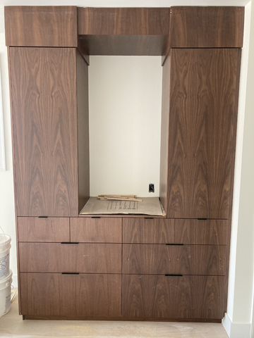 do not change the cabinets in any way preserve the exact cabinet colors materials finishes dimensions door and drawer styles hardware spacing alignment and all geometry exactly as shown do not alter the countertop shape backsplash appliances flooring lighting fixtures or wall structure only remove the construction materials clutter and mess from the scene clean the room and make it look finished and staged add a few simple tasteful home accessories appropriate for the style of the space but do not add or remove any furniture windows or architectural elements maintain the original lighting direction and realism enhance clarity and polish the photo while keeping the cabinetry and room design completely unchanged do not alter the lighting to keep the cabinet colors as they are in the image add new flooring put artwork between the cabinets with a sconce above stage with minimal accessories