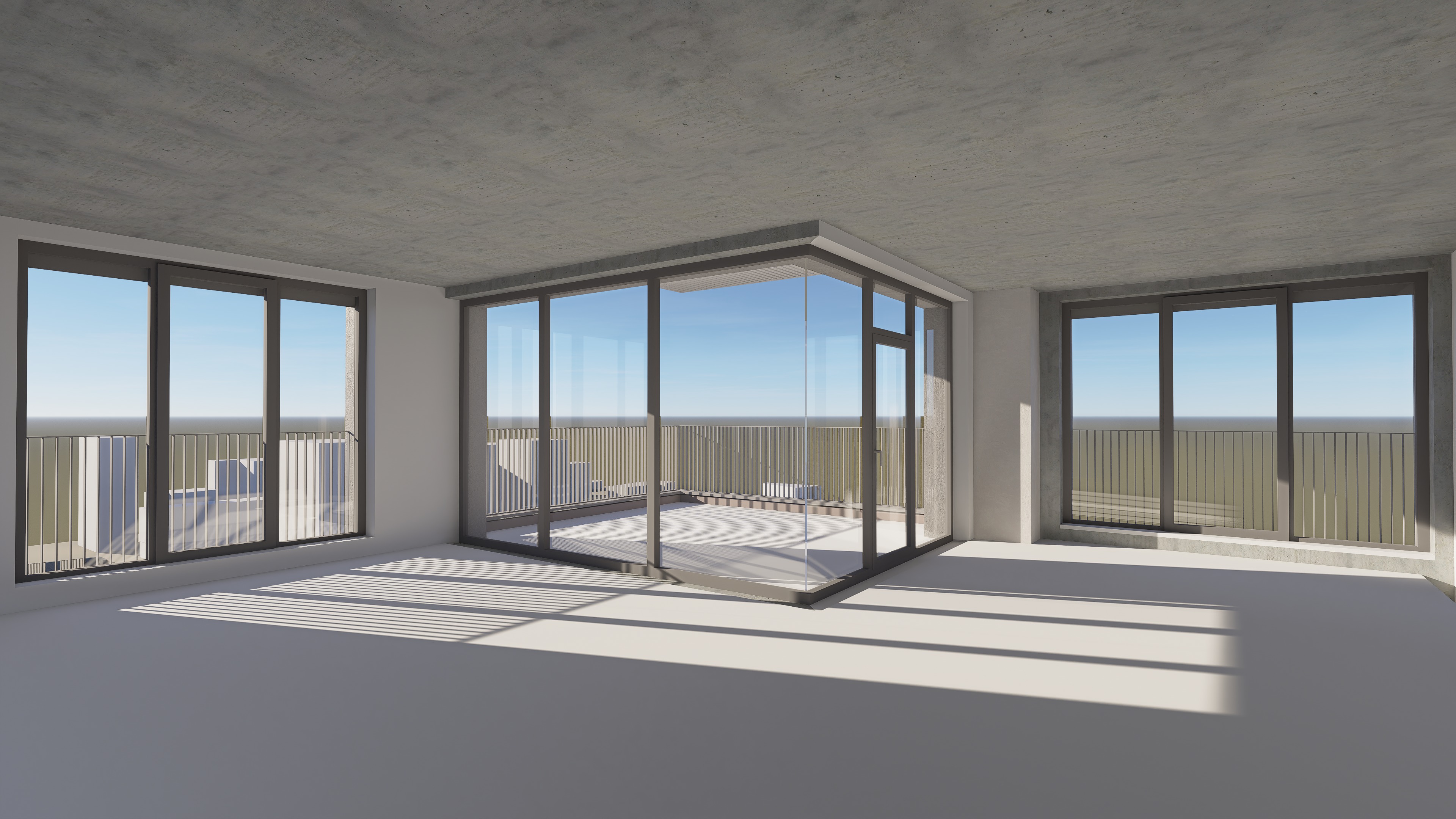 create a realistic architectural interior visualization while strictly preserving the exact camera position perspective room geometry window sizes and composition do not modify the architecture openings or layout set a warm summer outside with sunlight entering the room through the windows do not change exterior dont add building volumes adjust the lighting to a late summer evening atmosphere not sun in front of view hidden from point of view just few trees are far away because position of camera is on 24th floor of the building