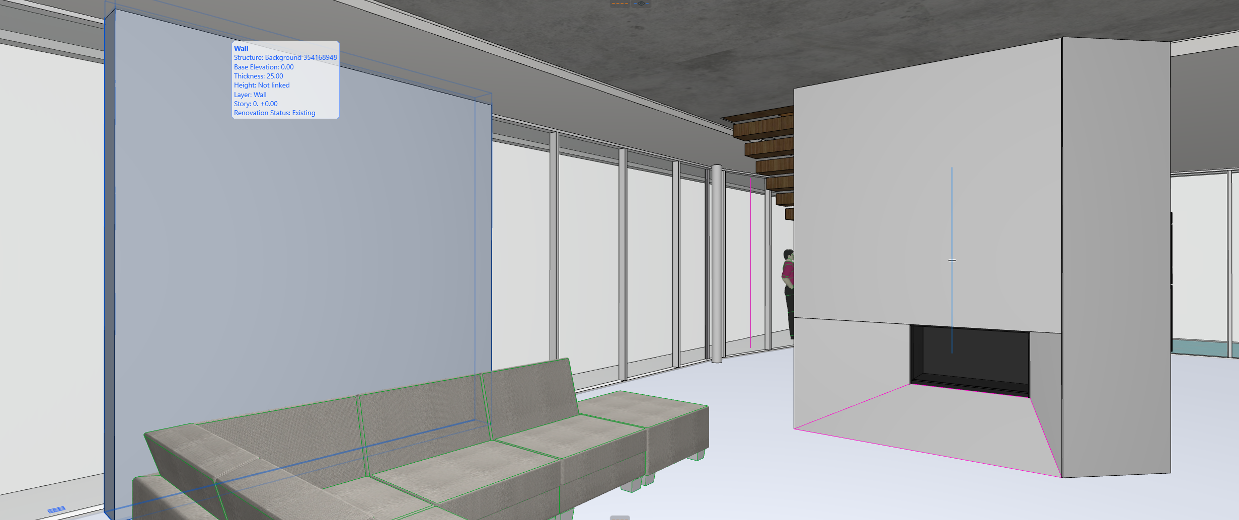 the sofa should be modern and minimalist the wall on the left should be decorated like not very crumpled paper with backlighting the fireplace lining should be satin broken white the concrete on the ceiling should be very light gray curtains in light ocher between the columns the floor should be microcement with a sandy light gray color the lighting on the suspended ceiling should be plaster recessed lights in the color of the ceiling