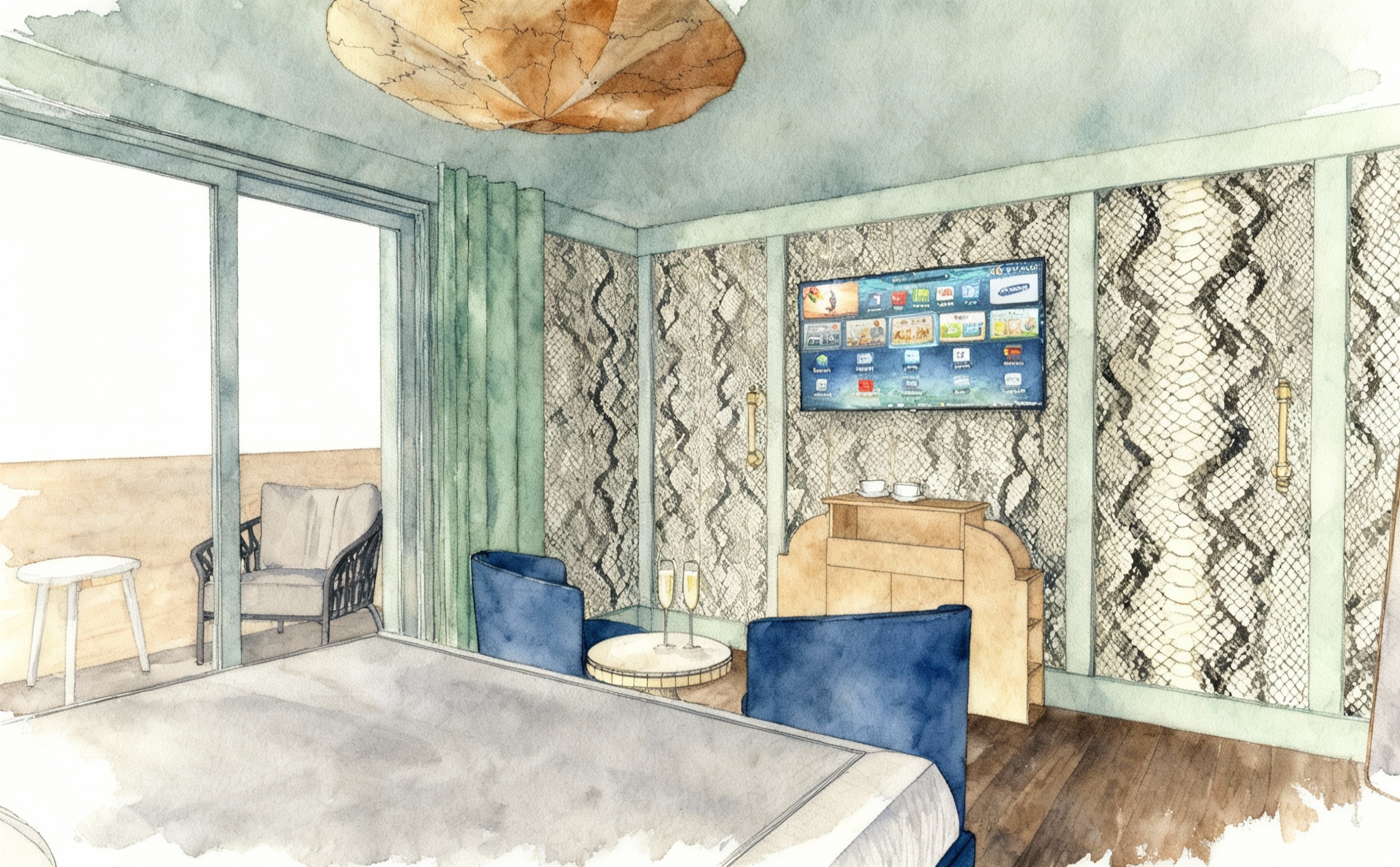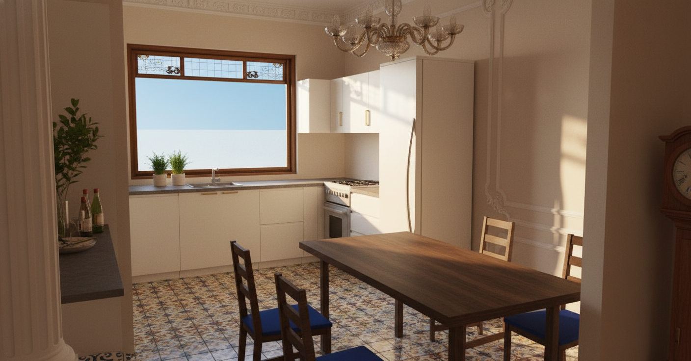 render with natural lighting keep everything as is but remove the left wall and make the wall color light flesh tone