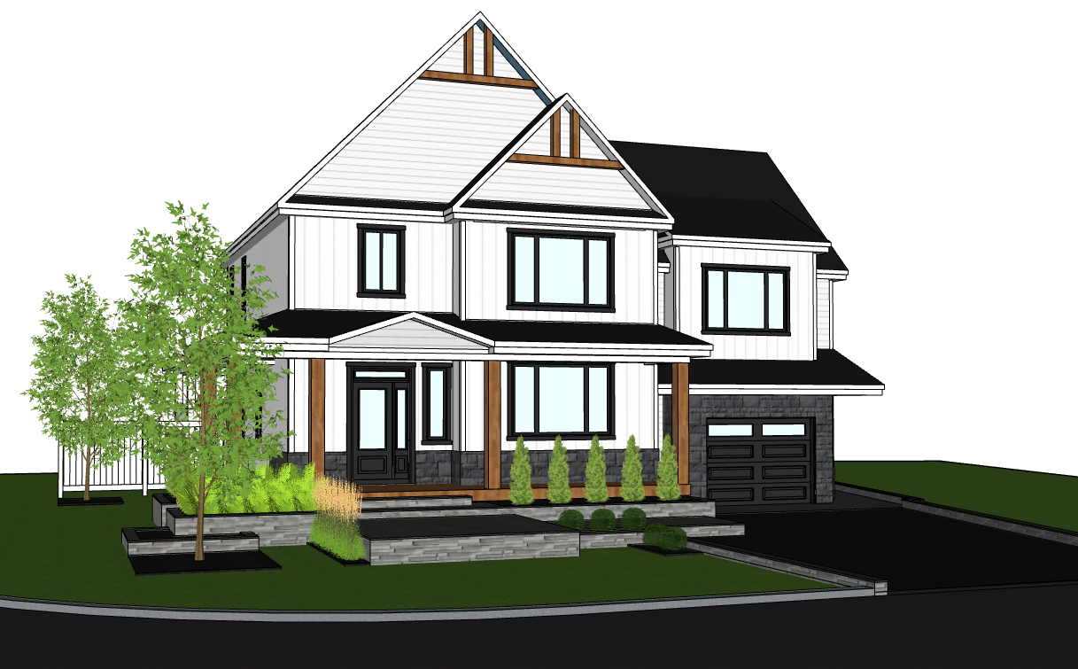 photorealistic exterior architectural rendering of a modern farmhouse style house using maintain color v2 white exterior with horizontal lap siding combined with vertical board and batten sections dark gray masonry stone veneer along the lower portion of the fa ade and around the garage door opening with accurate and realistic color preservation of the dark elements black asphalt shingle roof with realistic texture and clean sharp edges the house sits on a flat well maintained green lawn with mature trees in the background clear blue sky with the sun positioned high in the sky toward the front of the house creating consistent natural top front lighting across the fa ade realistic highlights soft and well defined shadows and strong depth without harsh contrast camera positioned at street level front left three quarter view showing depth along the left side of the house while keeping the main fa ade dominant ultra realistic materials accurate scale and proportions sharp architectural details natural daylight professional architectural photography style high resolution