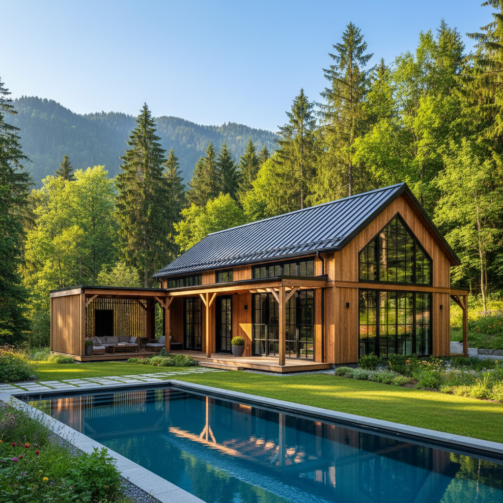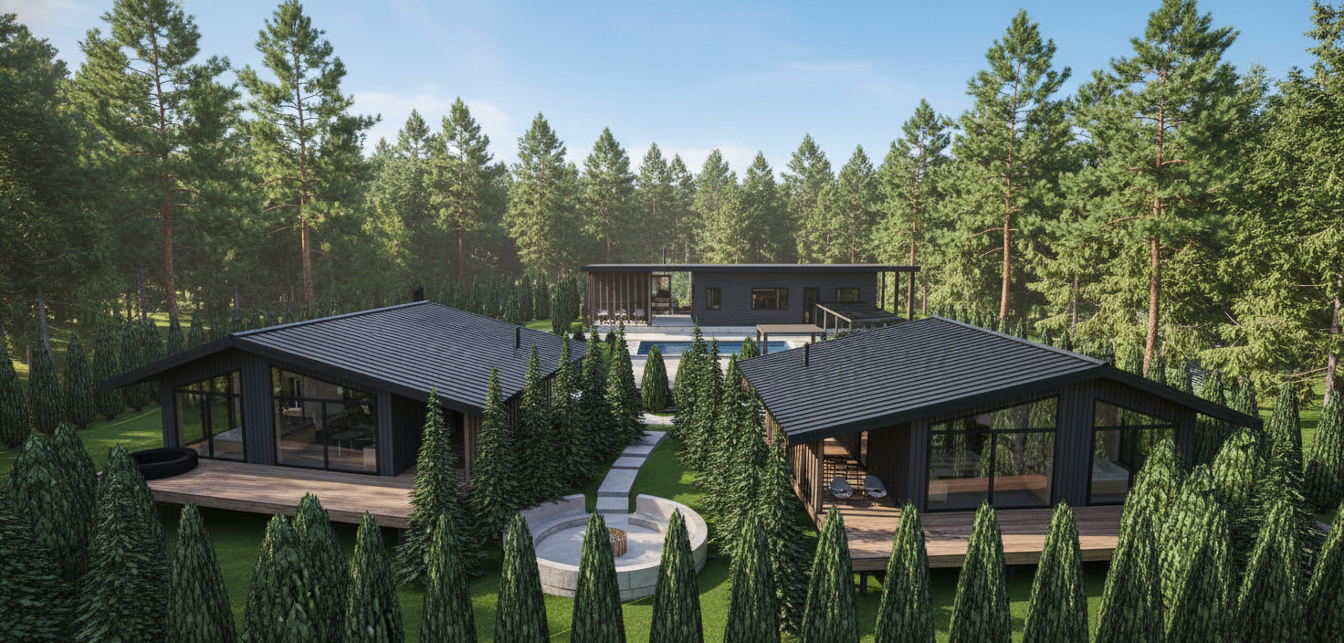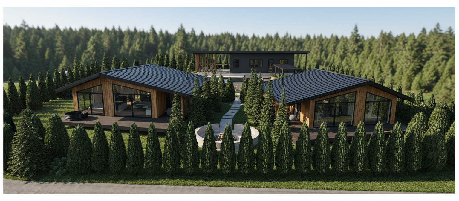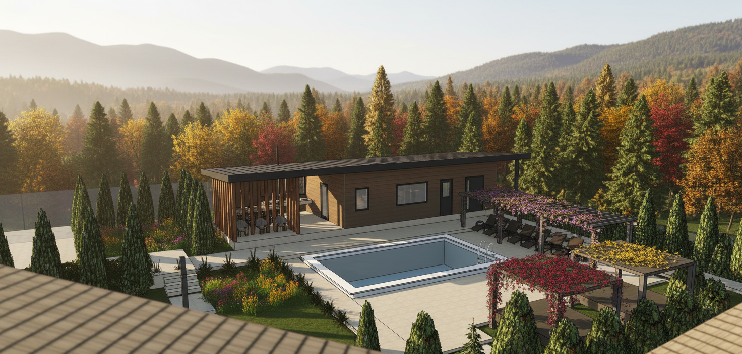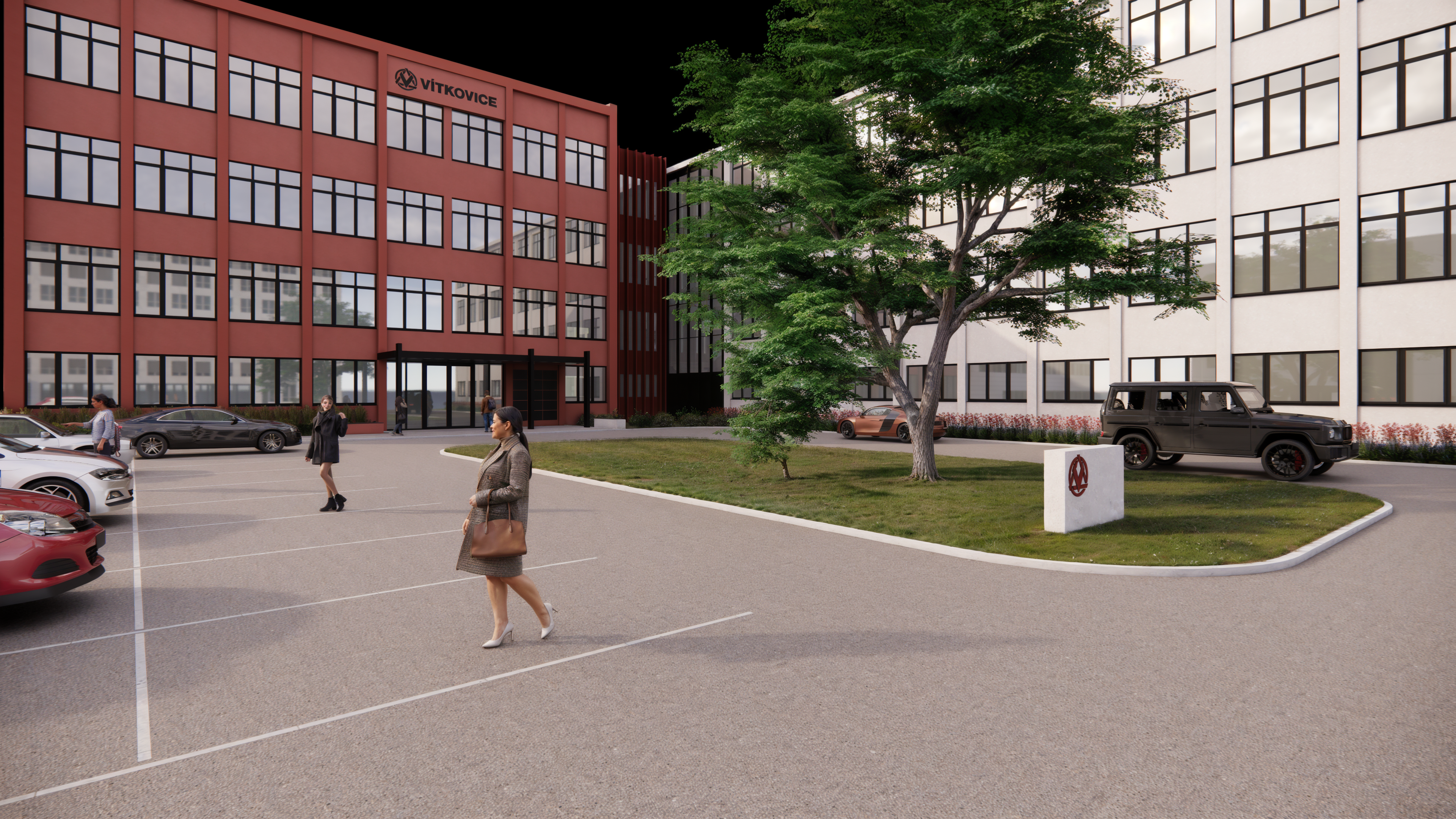 a modern office building with a contemporary design featuring a red plaster facade and large glass windows the adjacent building is a contrasting grey concrete complementing the vibrant greenery of well maintained trees and grass cars are parked in an orderly fashion including a black suv people in stylish professional attire walk through the parking lot creating a bustling atmosphere the scene is lit with warm natural sunlight that enhances the rich colors and provides a welcoming energetic ambiance