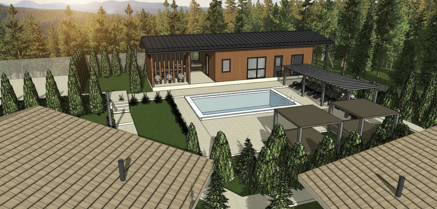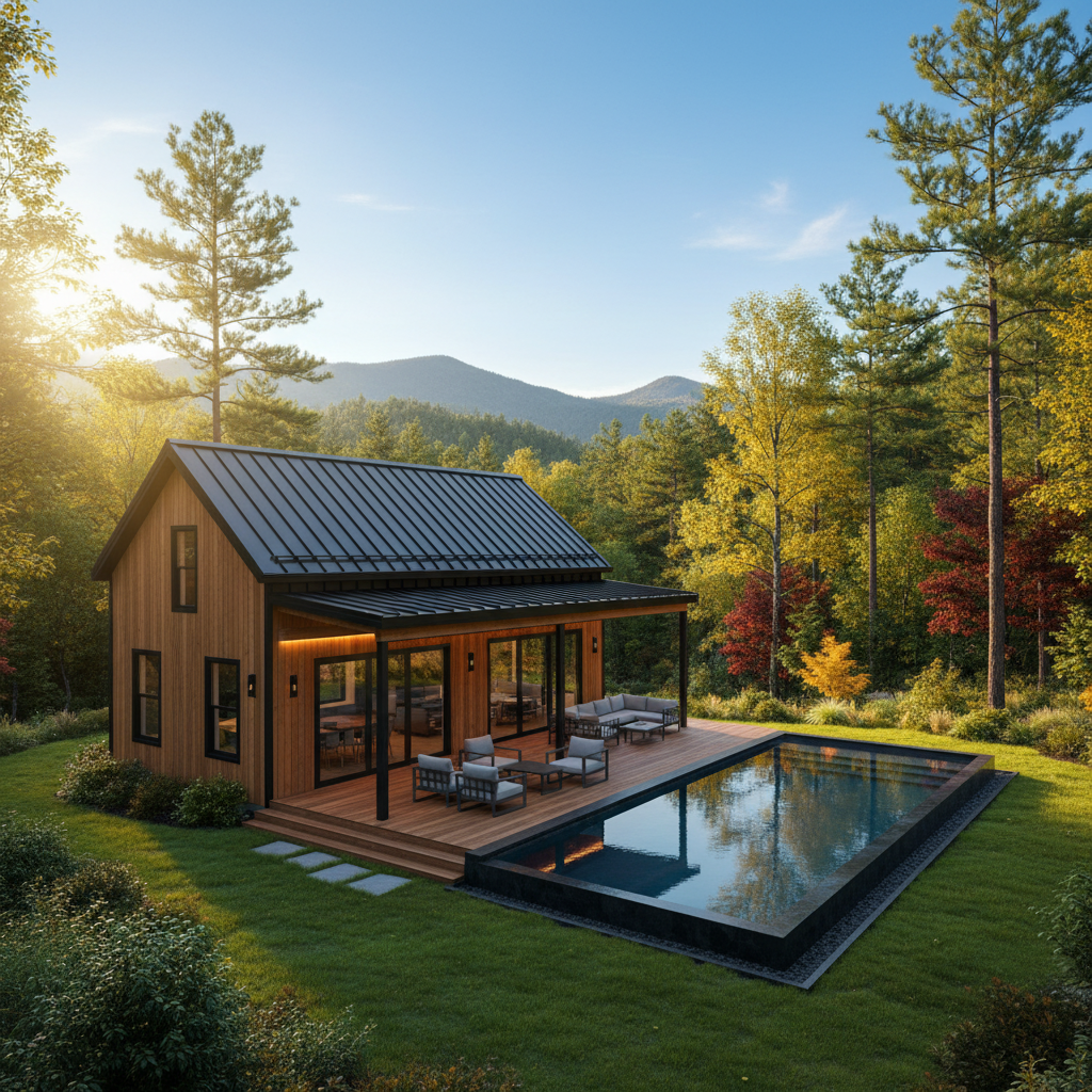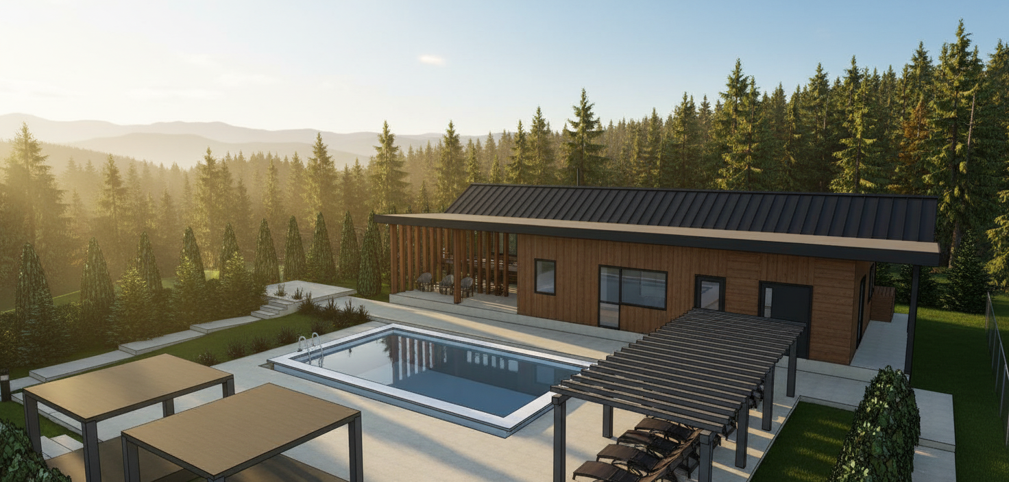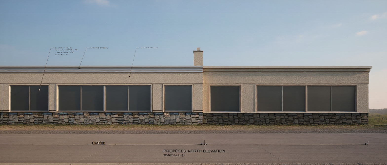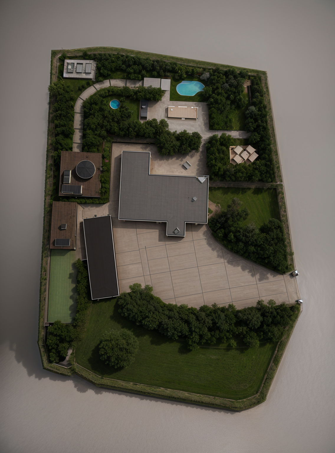 a modern office building with a contemporary design featuring a red plaster facade and large glass windows the adjacent building is a contrasting grey concrete complementing the vibrant greenery of well maintained trees and grass cars are parked in an orderly fashion including a black suv people in stylish professional attire walk through the parking lot creating a bustling atmosphere the scene is lit with warm natural sunlight that enhances the rich colors and provides a welcoming energetic ambiance